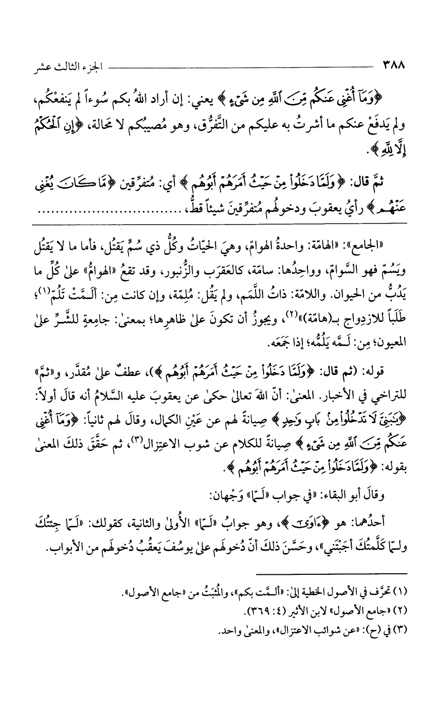 قوله: (ثم قال: (وَلَمَّا دَخَلُوا مِنْ حَيْثُ أَمَرَهُمْ أَبُوهُمْ))، عطف على مقدر، و"ثم" للتراخي في الأخبار. المعنى: أن الله تعالى حكى عن يعقوب عليه السلام أنه قال أولاً: (يَا بَنِي لا تَدْخُلُوا مِنْ بَابٍ وَاحِدٍ) صيانة لهم عن عين الكمال، وقال لهم ثانياً: (وَمَا أُغْنِي عَنكُمْ مِنْ اللَّهِ مِنْ شَيْءٍ) صيانة للكلام عن شوب الاعتزال، ثم حقق ذلك المعنى بقوله: (وَلَمَّا دَخَلُوا مِنْ حَيْثُ أَمَرَهُمْ أَبُوهُمْ).
