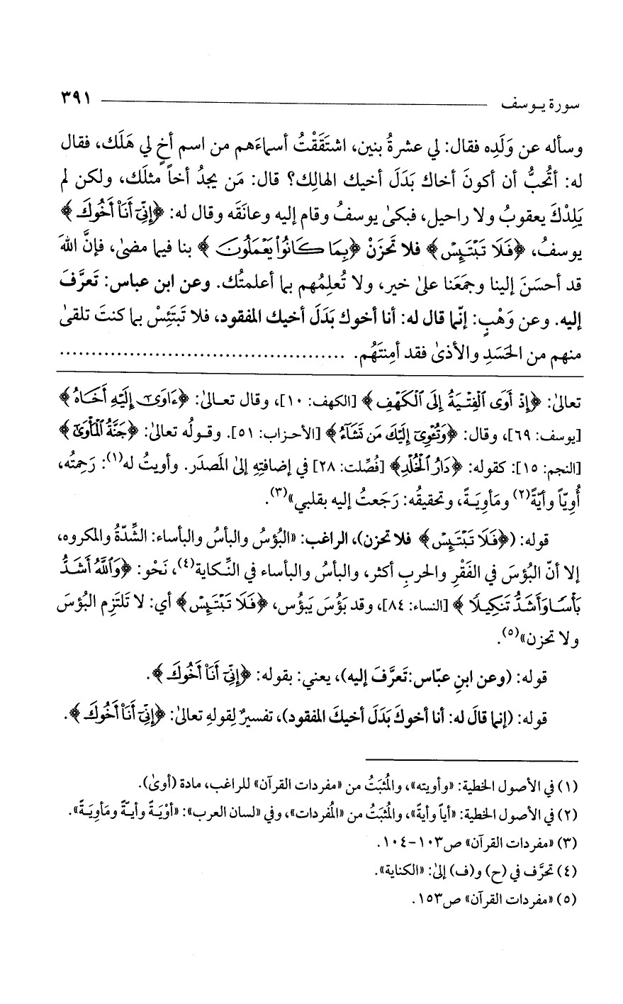 تعالى: (إِذْ أَوَى الْفِتْيَةُ إِلَى الْكَهْفِ) [الكهف: 10]، وقال تعالى: (آوَى إِلَيْهِ أَخَاهُ) [يوسف: 69]، وقال: (وَتُؤْوِي إِلَيْكَ مَنْ تَشَاءُ) [الأحزاب: 51]. وقوله تعالى: (جَنَّةُ الْمَاوَى) [النجم: 15]: كقوله: (دَارُ الْخُلْدِ) [فصلت: 28] في إضافته إلى المصدر. وأويت له: رحمته، أوياً وأيةً ومأوية، وتحقيقه: رجعت إليه بقلبي".