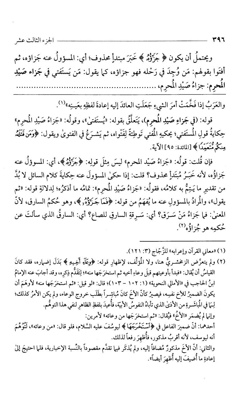 فإن قلت: قوله: "جزاء صيد المحرم" ليس مثل قوله: (جَزَاؤُهُ)، أي: المسئول عنه جزاؤه، لأنه خبر مبتدأ محذوف؟ قلت: إذا حكى المسئول عنه حكاية كلام السائل لابد من تقدير ما يتم به كلامه، فقوله: "جزاء صيد المحرم": تمامه ما أذكره؛ لدلالة قوله: "ثم يقول"، والمراد بالمسئول عنه ما يفهم من قوله: (فَمَا جَزَاؤُهُ)، وهو حكم السارق، لأن المعنى: فما جزاء من سرق؟ أيك سرقة السارق للصاع؟ أي: السارق الذي سألت عن حكمه هو جزاؤه.