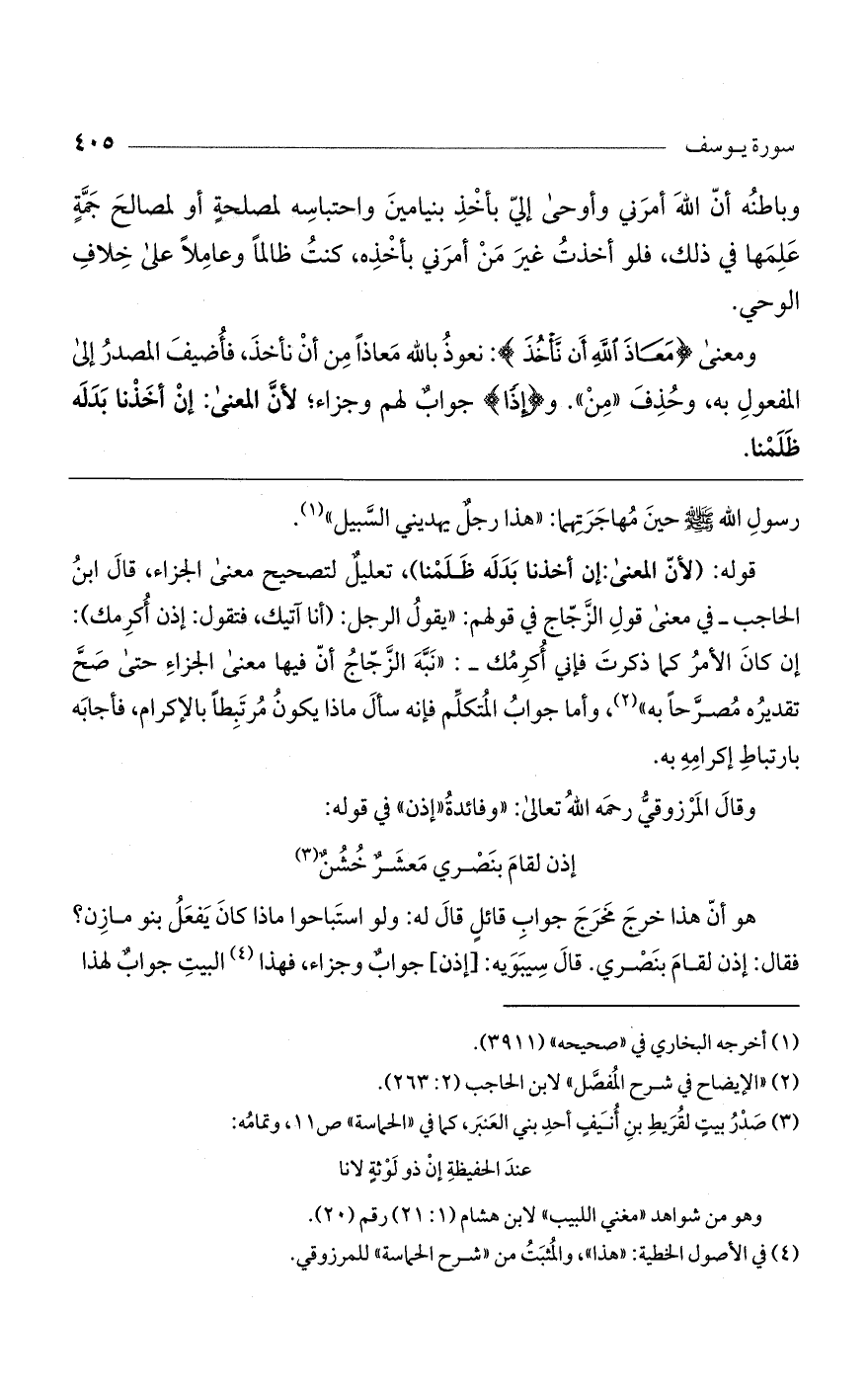 ومعنى (مَعاذَ اللَّهِ أَنْ نَاخُذَ) نعوذ بالله معاذاً من أن نأخذ، فأضيف المصدر إلى المفعول به وحذف "من". و (إِذاً) جوابٌ لهم وجزاء، لأن المعنى: إن أخذنا بدله ظلمنا.
