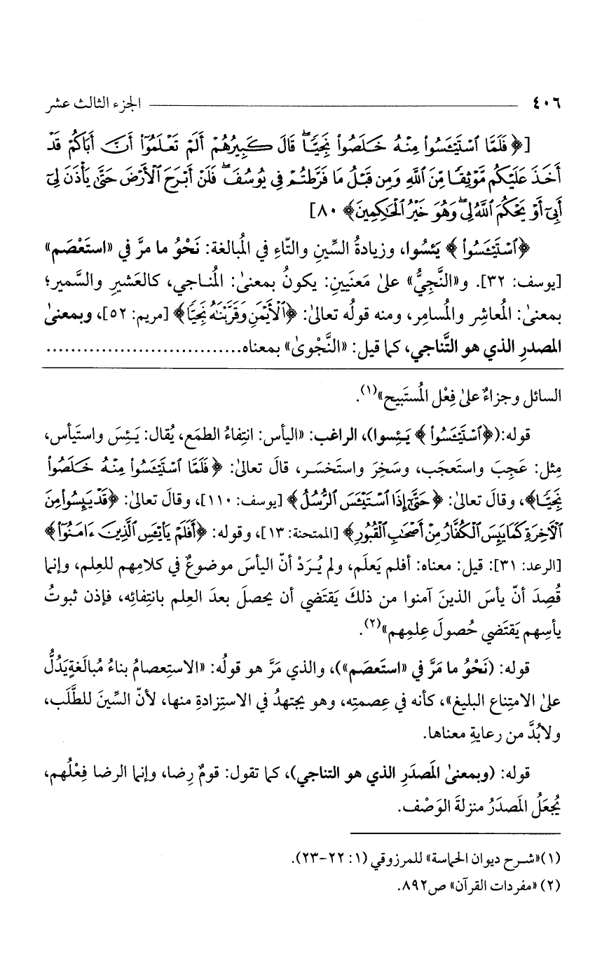 (اسْتَيْأَسُوا) يئسوا. وزيادة السين والتاء في المبالغة نحو ما مرّ في "استعصم" [يوسف: 32]. و «النجي» على معنيين: يكون بمعنى: المناجى، كالعشير والسمير؛ بمعنى: المعاشر والمسامر، ومنه قوله تعالى (الأيمن وَقَرَّبْناهُ نَجِيًّا) [مريم: 52]، وبمعنى المصدر الذي هو التناجي، كما قيل "النجوى" بمعناه