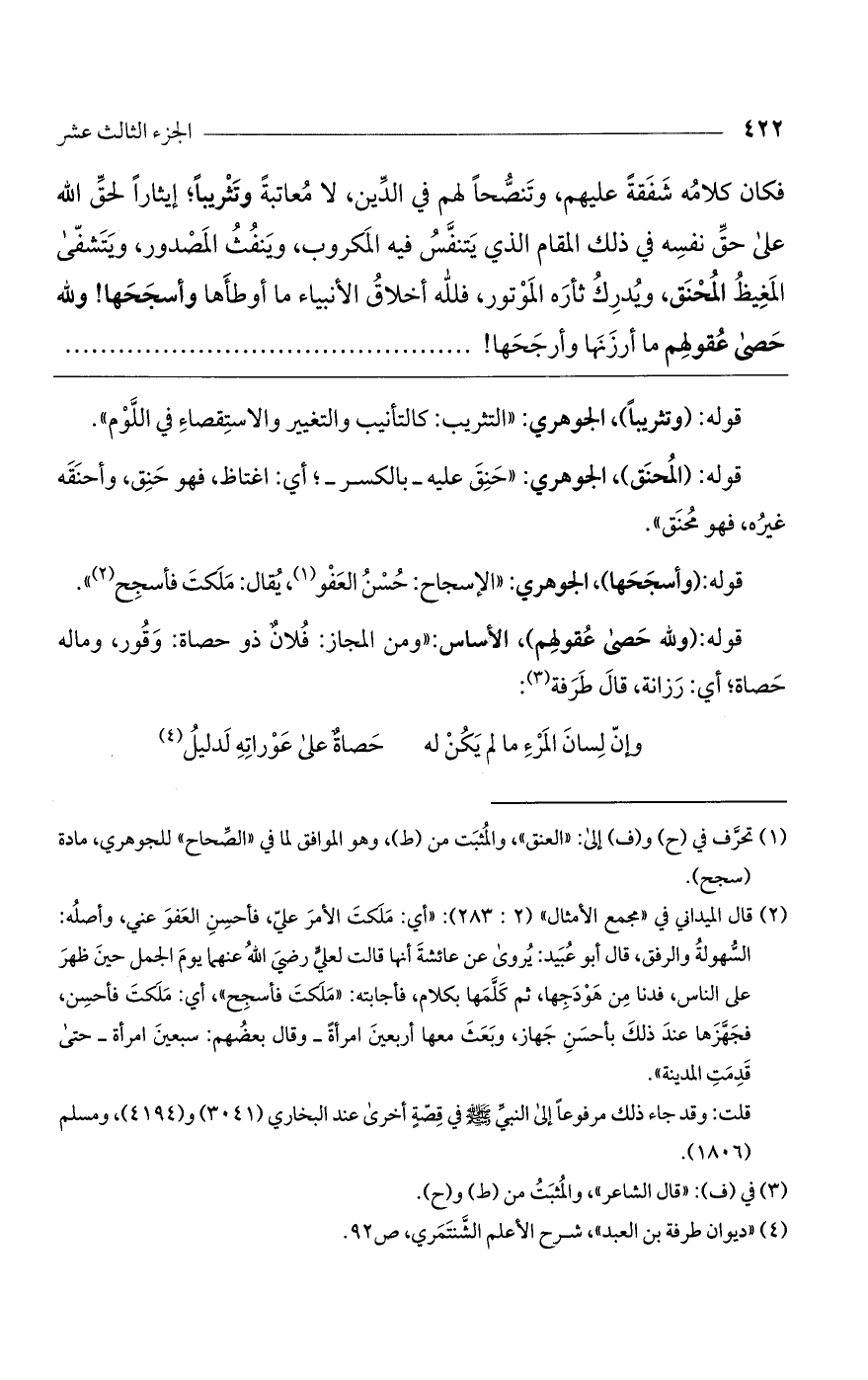 فكان كلامه شفقة عليهم، وتنصحاً لهم في الدين، لا معاتبة وتثريباً، إيثاراً لحق الله على حق نفسه، في ذلك المقام الذي يتنفس فيه المكروب، وينفث المصدور، ويتشفى المغيظ المحنق، ويدرك ثأره الموتور، فلله أخلاق الأنبياء ما أوطأها وأسجحها ولله حصا عقولهم ما أرزنها وأرجحها!
