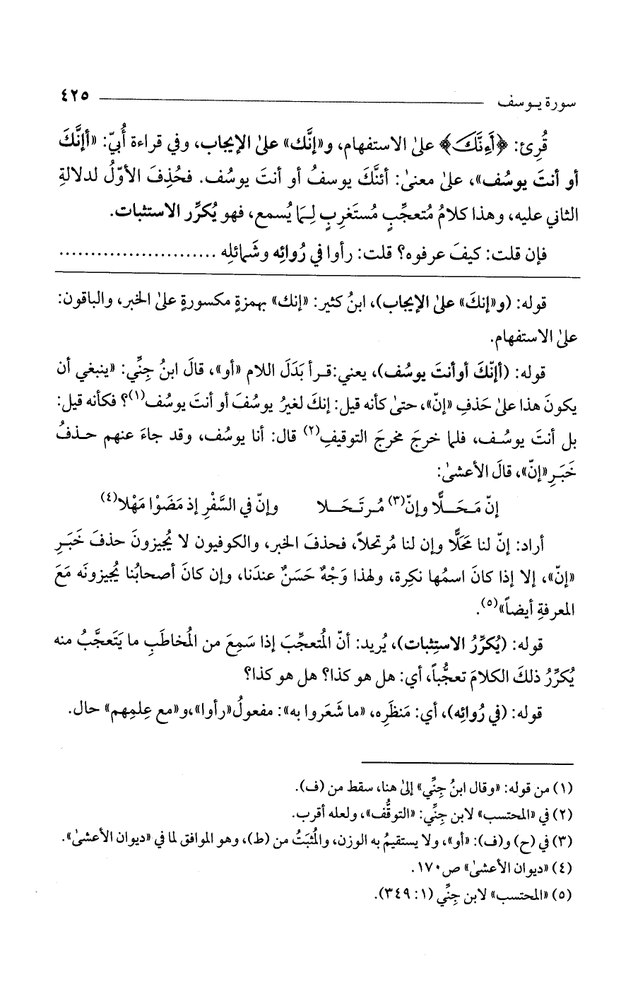 قرئ: (أَإِنَّكَ) على الاستفهام، و"إنك" على الإيجاب، وفي قراءة أُبيّ: "أإنك أو أنت يوسف"، على معنى: أئنك يوسف أو أنت يوسف. فحذف الأوّل لدلالة الثاني عليه، وهذا كلام متعجب مستغرب لما يسمع، فهو يكرر الاستثبات.
