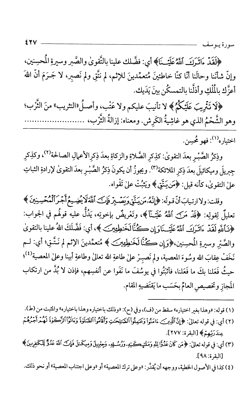 وقلت: ولا ارتياب أن قوله: (إِنَّهُ مَنْ يَتَّقِ وَيَصْبِرْ فَإِنَّ اللَّهَ لا يُضِيعُ أَجْرَ الْمُحْسِنِينَ) تعليل لقوله: (قَدْ مَنَّ اللَّهُ عَلَيْنَا)، وتعريض بإخوته، يدل عليه قولهم في الجواب: (تَاللَّهِ لَقَدْ آثَرَكَ اللَّهُ عَلَيْنَا وَإِنْ كُنَّا لَخَاطِئِينَ)، أي: فضلك الله علينا بالتقوى والصبر وسيرة المحسنين، (وَإِنْ كُنَّا لَخَاطِئِينَ) متعمدين الإثم لم نتق؛ أي: لم نخف عقاب الله وسوء المعصية، ولم نصبر على طاعة الله تعالى وطاعة أبينا وعلى المعصية؛ حيث فعلنا بك ما فعلنا، فأثبتوا في يوسف ما نفوا عن أنفسهم، فإذن لابد من ارتكاب المجاز وتخصيص العام بحسب ما يقتضيه المقام.