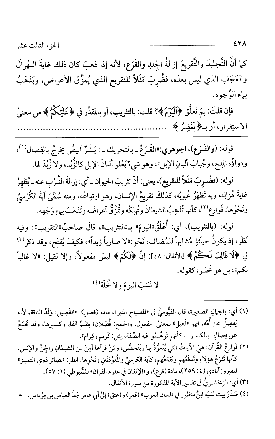 قوله: (فضرب مثلاً للتقريع)، يعني: أن تثريب الحيوان- أي: إزالة الثرب عنه- يظهر غاية هزاله، وبه تظهر عيوبه، كذلك تقريع الإنسان، وهو ارتداعه، ومنه سمي آية الكرسي ونحوها: قوارع، كأنها تذهب الشيطان وتهلكه وتمزق أعراضه وتذهب بماء وجهه.