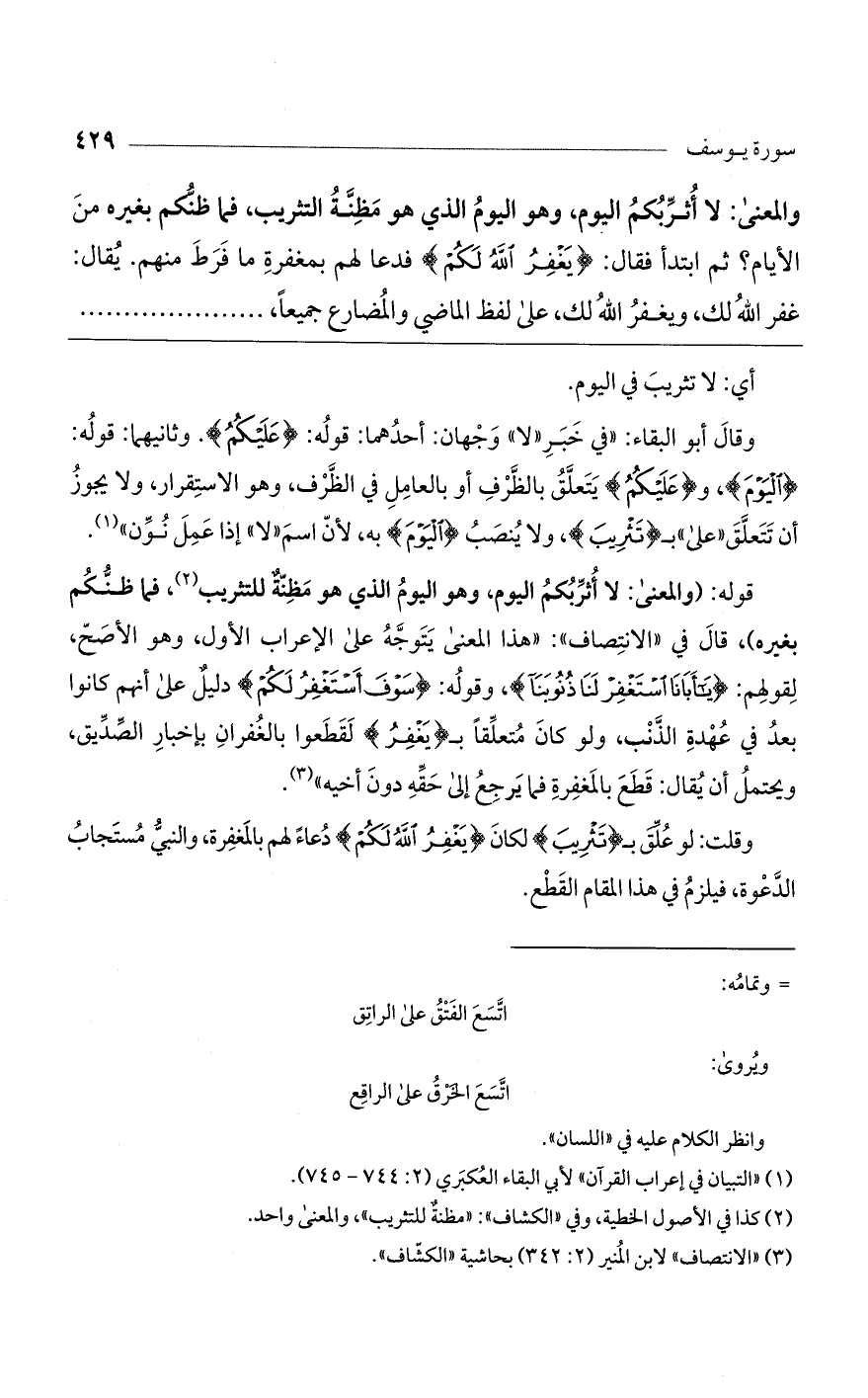 وقال أبو البقاء: "في خبر "لا" وجهان: أحدهما: قوله: (عَلَيْكُمُ). وثانيهما: قوله: (الْيَوْمَ)، و (عَلَيْكُمُ) يتعلق بالظرف أو بالعامل في الظرف، وهو الاستقرار، ولا يجوز أن تتعلق "على" بـ (تَثْرِيبَ)، ولا ينصب (الْيَوْمَ) به، لأن اسم "لا" إذا عمل نون".
