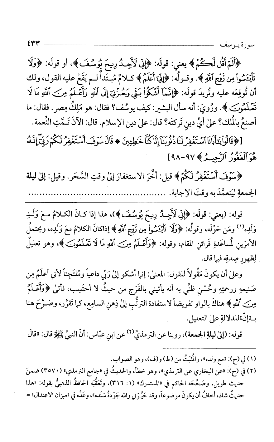 قوله: (يعني: قوله: (إِنِّي لأَجِدُ رِيحَ يُوسُفَ))، هذا إذا كان الكلام مع ولد ولده ومن حوله، وقوله: (وَلا تَيْئَسُوا مِنْ رَوْحِ اللَّهِ) إذا كان الكلام مع ولده، ويحتمل الأمرين لمساعدة قرائن المقام، وقوله: (وَأَعْلَمُ مِنْ اللَّهِ مَا لا تَعْلَمُونَ)، وهو تعليل لظهور صدقه فيما قال.