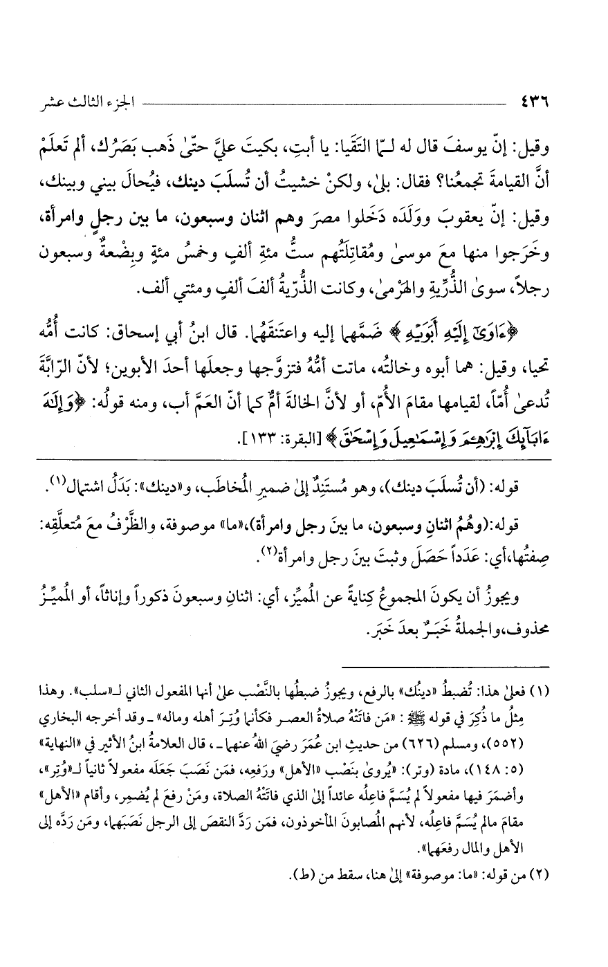 وقيل: إن يوسف قال له لما التقيا: يا أبت، بكيت عليّ حتى ذهب بصرك، ألم تعلم أن القيامة تجمعنا؟ فقال: بلى، ولكن خشيت أن تسلب دينك فيحال بيني وبينك، وقيل: إنّ يعقوب وولده دخلوا مصر وهم اثنان وسبعون، ما بين رجل وامرأة، وخرجوا منها مع موسى ومقاتلتهم ستمائة ألف وخمسمائة وبضعة وسبعون رجلا سوى الذرية والهرمى، وكانت الذرّية ألف ألف ومئتي ألف.