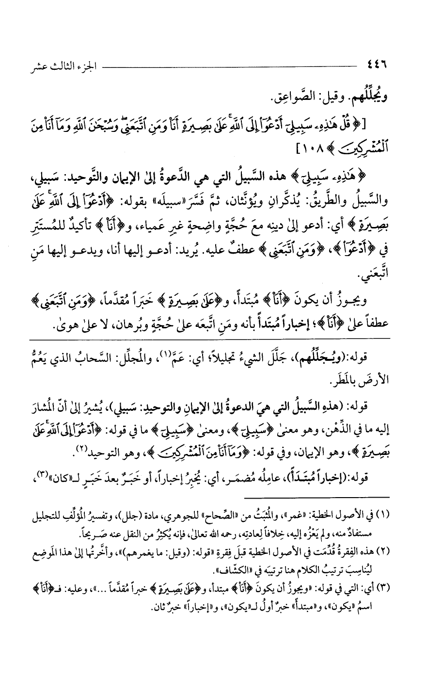 قوله: (هذه السبيل التي هي الدعوة إلى الإيمان والتوحيد: سبيلي)، يشير إلى أن المشار إليه ما في الذهن، وهو معنى (سَبِيلِي)، ومعنى (سَبِيلِي) ما في قوله: (أَدْعُو إِلَى اللَّهِ عَلَى بَصِيرَةٍ)، وهو الإيمان، وفي قوله: (وَمَا أَنَا مِنْ الْمُشْرِكِينَ)، وهو التوحيد.