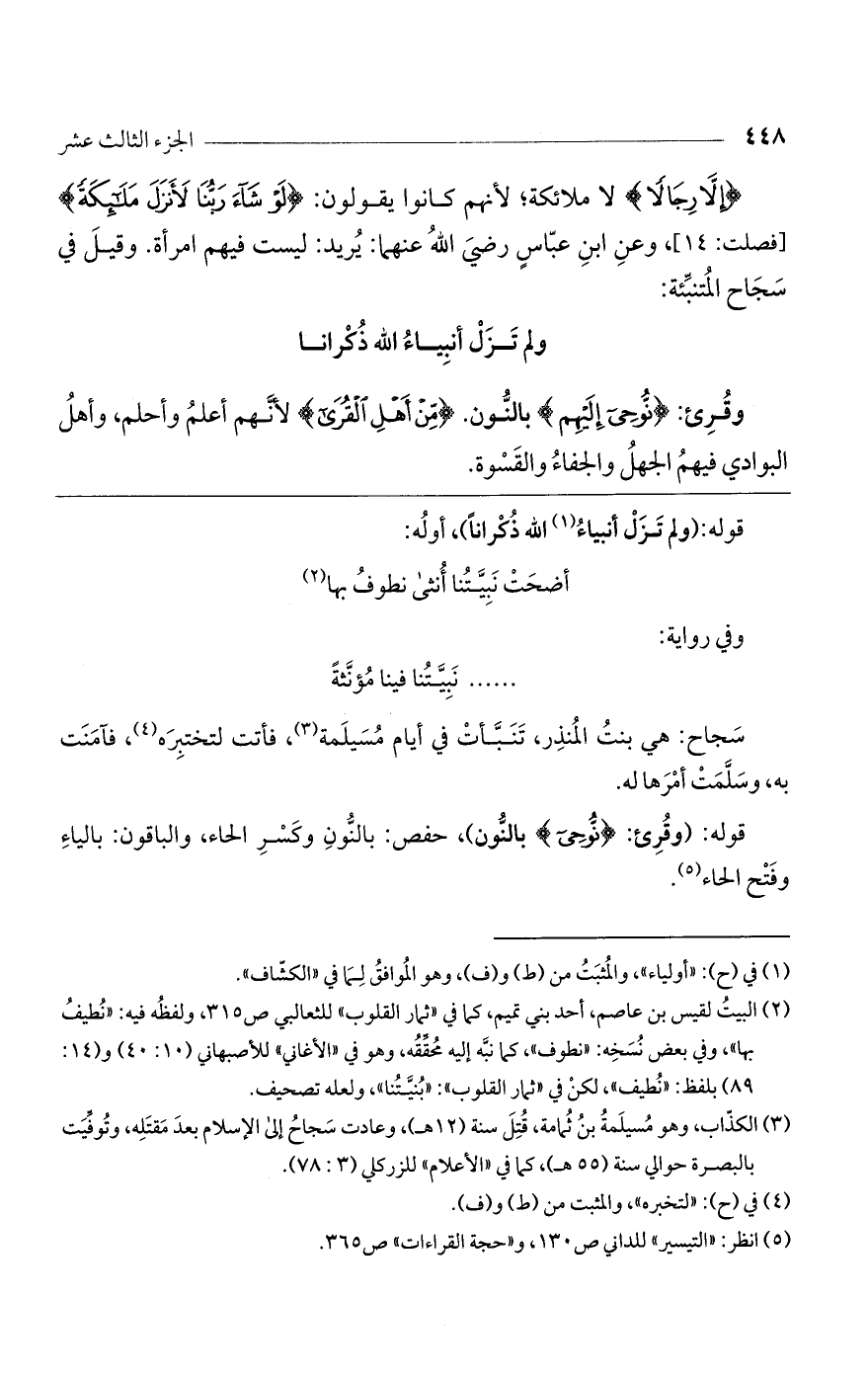 سجاح: هي بنت المنذر، تنبأت في أيام مسليمة، فأتت لتختبره، فآمنت به، وسلمت أمرها له.