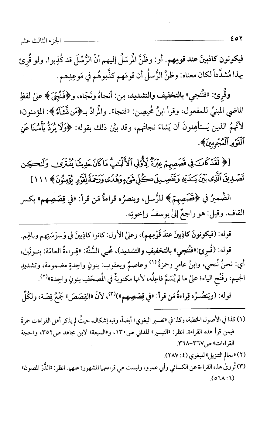 قوله: (قرئ: فننجي" بالتخفيف والتشديد)، محيي السنة: "قراءة العامة: بنونين، أي: نحن ننجي، وابن عامر وحمزة وعاصم ويعقوب: بنون واحدة مضمومة، وتشديد الجيم، وفتح الياء؛ على ما لم يسم فاعله، لأنها مكتوبة في المصحف بنون واحدة".