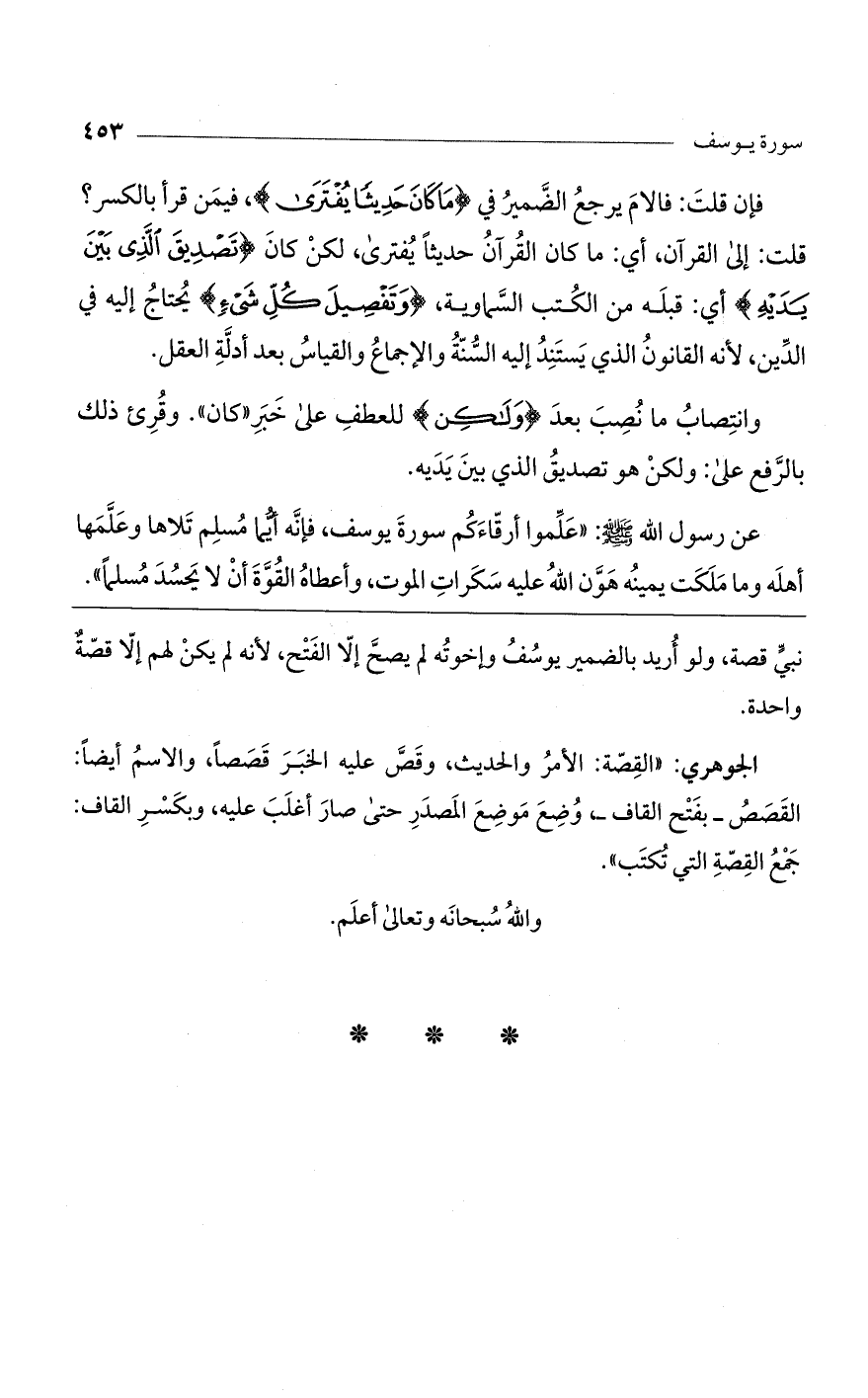 فإن قلت: فإلام يرجع الضمير في (ما كانَ حَدِيثاً يُفْتَرى)، فيمن قرأ بالكسر؟ قلت: إلى القرآن، أي: ما كان القرآن حديثاً يفترى لكِنْ كان (تَصْدِيقَ الَّذِي بَيْنَ يَدَيْهِ) أي: قبله من الكتب السماوية (وَتَفْصِيلَ كُلِّ شَيْءٍ) يحتاج إليه في الدين، لأنه القانون الذي يستند إليه السنة والإجماع والقياس بعد أدلة العقل.