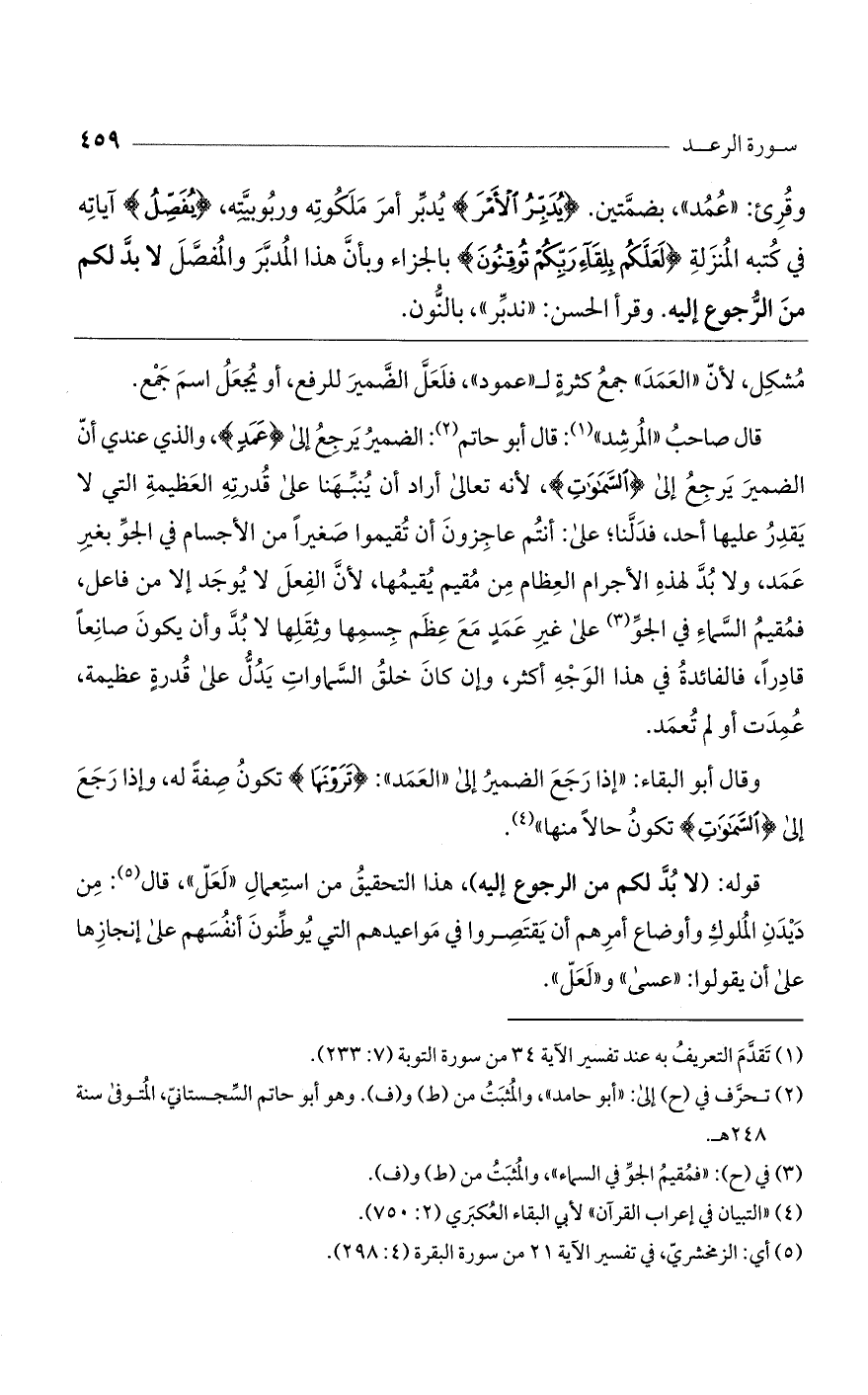 قال صاحب "المرشد": قال أبو حاتم: الضمير يرجع إلى (عَمَدٍ)، والذي عندي أن الضمير يرجع إلى (السَّمَوَاتِ)، لأنه تعالى أراد أن ينبهنا على قدرته العظيمة التي لا يقدر عليها أحد، فدلنا؛ على: أنتم عاجزون أن تقيموا صغيراً من الأجسام في الجو بغير عمد، ولابد لهذه الأجرام العظام من مقيم يقيمها، لأن الفعل لا يوجد إلا من فاعل، فمقيم السماء في الجو على غير عمد مع عظم جسمها وثقلها لابد وأن يكون صانعاً قادراً، فالفائدة في هذا الوجه أكثر، وإن كان خلق السماوات يدل على قدرة عظيمة، عمدت أو لم تعمد.