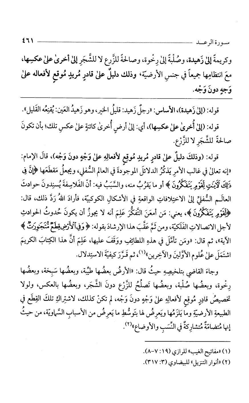 قوله: (وذلك دليل على قادر مريد موقع لأفعاله على وجه دون وجه)، قال الإمام: "إنه تعالى في غالب الأمر يذكر الدلائل الموجودة في العالم السفلي، ويجعل مقطعها (إِنَّ فِي ذَلِكَ لآيَاتٍ لِقَوْمٍ يَتَفَكَّرُونَ) أو ما يقرب منه، والسبب فيه: أن الفلاسفة يسندون حوادث العالم السفلي إلى الاختلافات الواقعة في الأشكال الكوكبية، فأراد الله رد ذلك، قال: (لِقَوْمٍ يَتَفَكَّرُونَ)، يعني: من أمعن التفكر علم أنه لا يجوز أن يكون حدوث الحوادث لأجل الاتصالات الفلكية، ومن ثم عقب هذا الإرشاد بقوله: (وَفِي الأَرْضِ قِطَعٌ مُتَجَاوِرَاتٌ) الآية"، ثم قال: "ومن تأمل في هذه اللطائف ووقف عليها، علم أن هذا الكتاب الكريم اشتمل على علوم الأولين والآخرين"، ثم قرر كيفية الاستدلال.