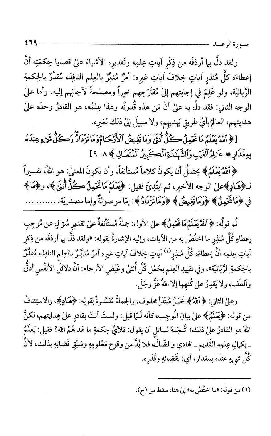 (اللَّهُ يَعْلَمُ) يحتمل أن يكون كلاماً مستأنفاً، وأن يكون المعنى: هو الله، تفسيراً لـ (هادٍ) على الوجه الأخير، ثم ابتدئ فقيل: (يَعْلَمُ ما تَحْمِلُ كُلُّ أُنْثى) و (ما) في (ما تَحْمِلُ)، (وَما تَغِيضُ)، (وَما تَزْدادُ): إما موصولة وإما مصدرية