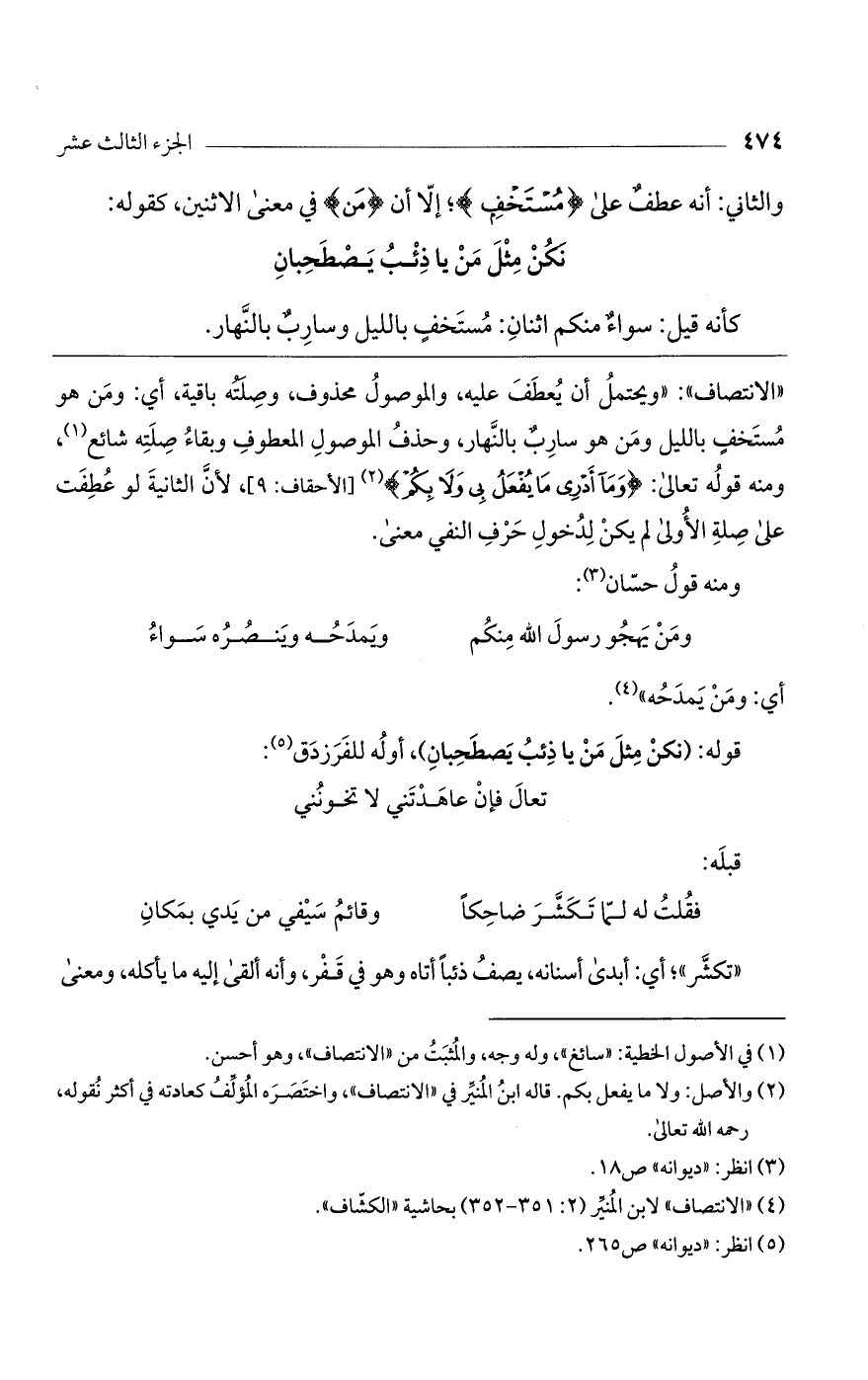 "الانتصاف": "ويحتمل أن يعطف عليه، والموصول محذوف، وصلته باقية، أي: ومن هو مستخف بالليل ومن هو سارب بالنهار، وحذف الموصول المعطوف وبقاء صلته شائع، ونمه قوله تعالى: (وَمَا أَدْرِي مَا يُفْعَلُ بِي وَلا بِكُمْ) [الأحقاف: 9]، لأن الثانية لو عطفت على صلة الأولى لم يكن لدخول حرف النفي معنى.