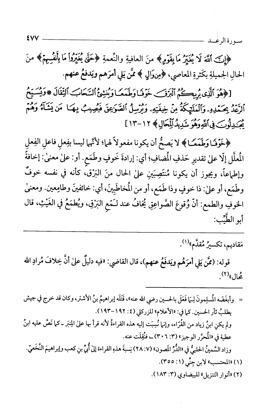 (خَوْفاً وَطَمَعاً) لا يصح أن يكونا مفعولاً لهما؛ لأنهما ليسا بفعل فاعل الفعل المعلل إلا على تقدير حذف المضاف، أي: إرادة خوفٍ وطمعٍ. أو: على معنى: إخافة وإطماعاً. ويجوز أن يكونا منتصبين على الحال من البرق، كأنه في نفسه خوف وطمع. أو على: ذا خوف وذا طمع. أو من المخاطبين، أي: خائفين وطامعين. ومعنى الخوف والطمع: أنّ وقوع الصواعق يخاف عند لمع البرق، ويطمع في الغيث. قال أبو الطيب: