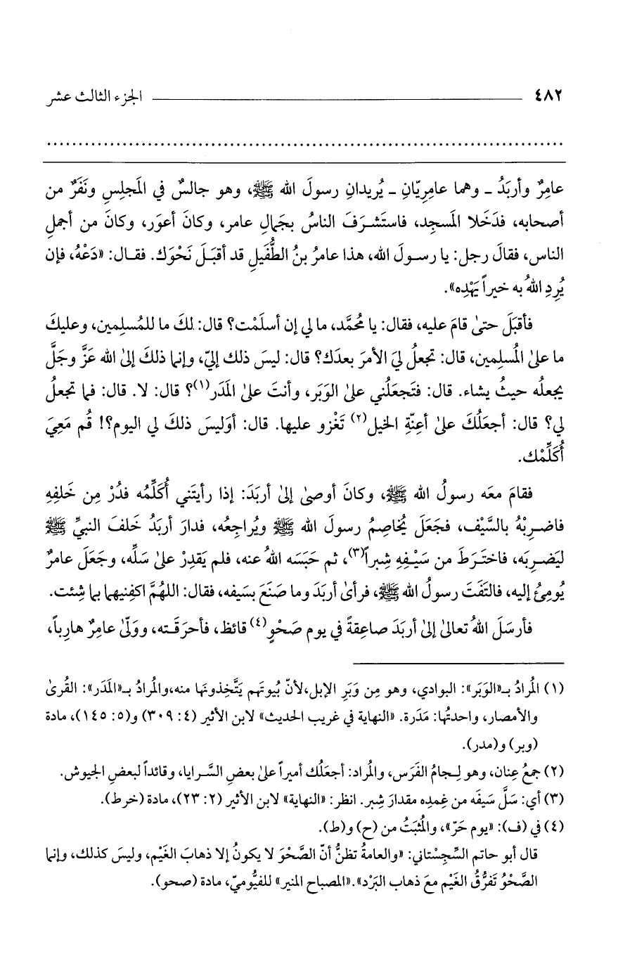 عامر وأربد- وهما عامريان- يريدان رسول الله صلى الله عليه وسلم، وهو جالس في المجلس ونفر من أصحابه، فدخلا المسجد، فاستشرف الناس بجمال عامر، وكان أعور، وكان من أجمل الناس، فقال رجل: يا رسول الله، هذا عامر بن الطفيل قد أقبل نحوك. فقال: "دعه، فإن يرد الله به خيراً يهده".