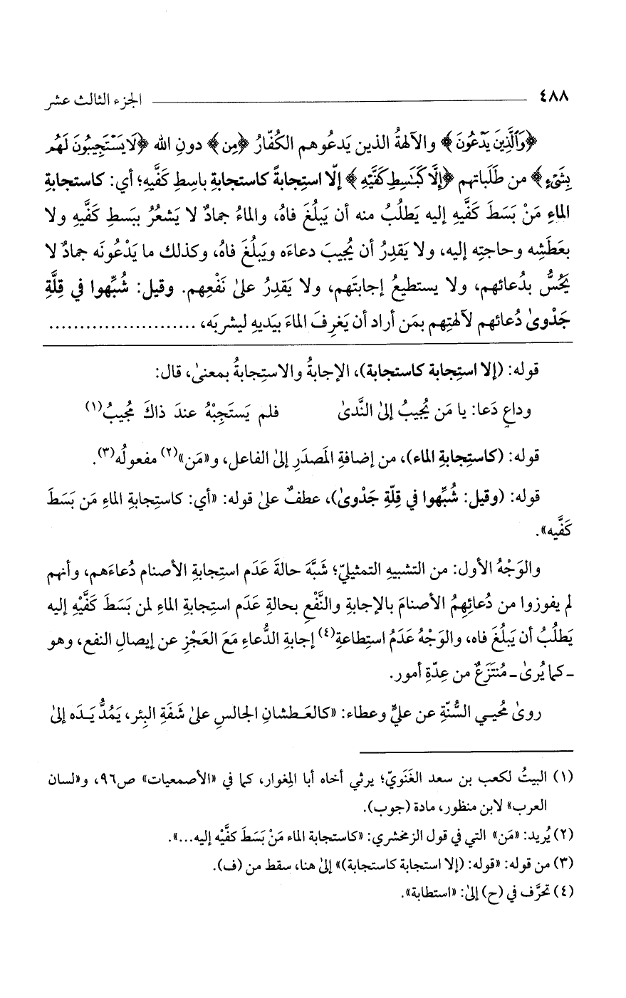 والوجه الأول: من التشبيه التمثيلي؛ شبه حالة عدم استجابة الأصنام دعاءهم، وأنهم لم يفوزوا من دعائهم الأصنام بالإجابة والنفع بحالة عدم استجابة الماء لمن بسط كفيه إليه يطلب أن يبلغ فاه، والوجه عدم استطاعة إجابة الدعاء مع العجز عن إيصال النفع، وهو- كما يرى- منتزع من عدة أمور.