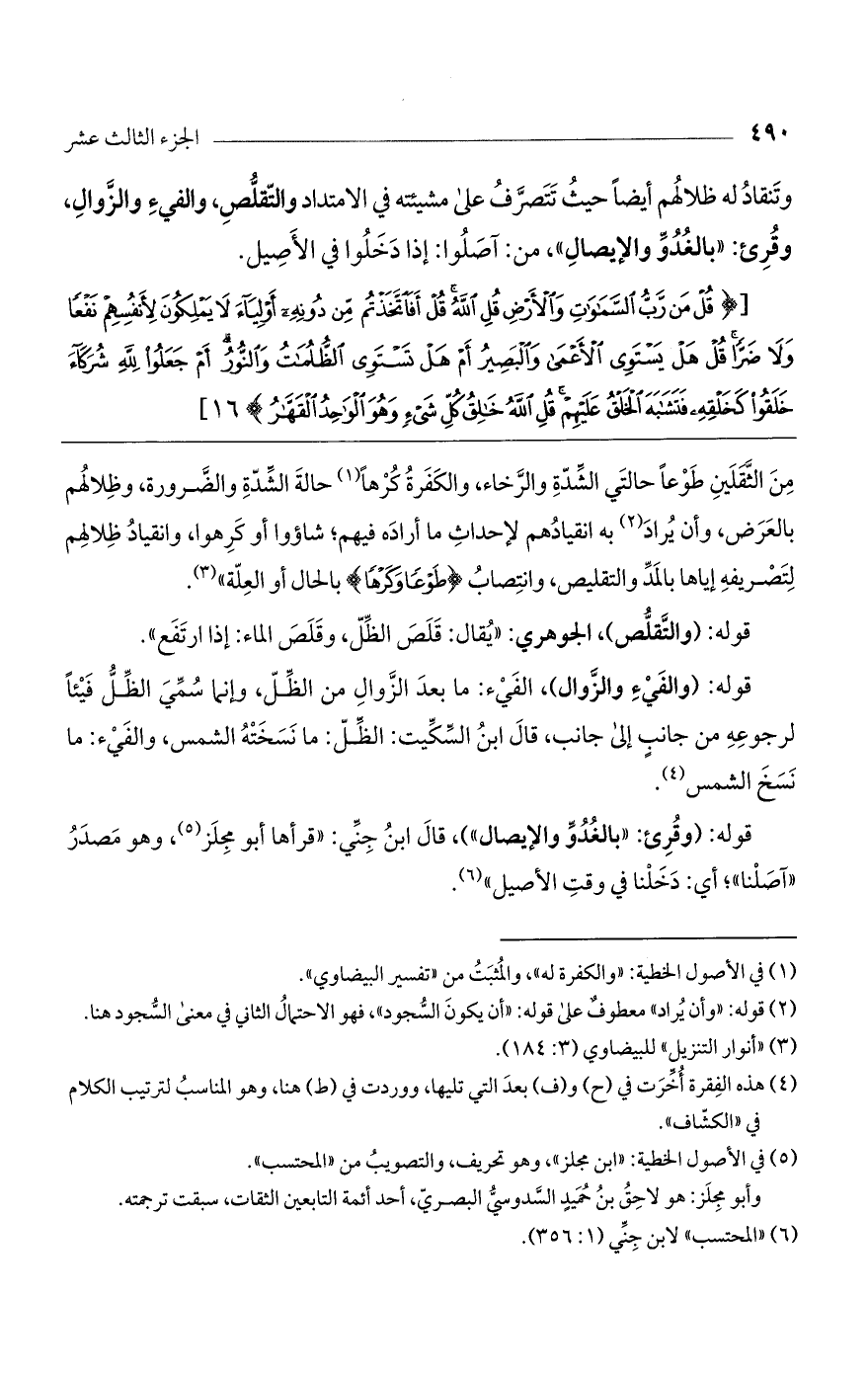 وتنقاد له ظِلالُهُمْ أيضاً حيث تتصرف على مشيئته في الامتداد والتقلص، والفيء والزوال. وقرئ: "بالغدوّ والإيصال"، من: آصلوا: إذا دخلوا في الأصيل.