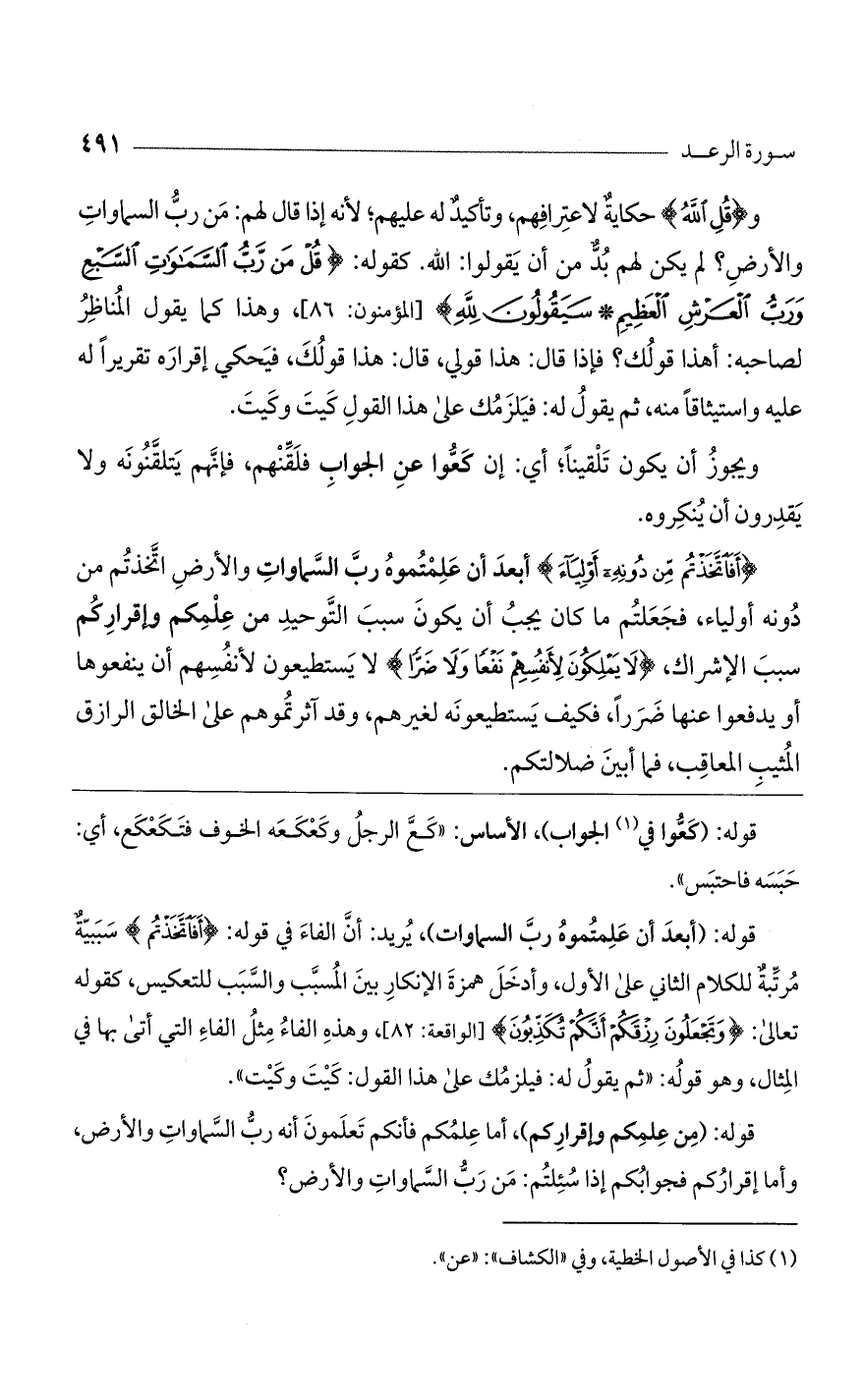 و (قُلِ اللَّهُ) حكاية لاعترافهم، وتأكيد لم عليهم، لأنه إذا قال لهم: من رب السموات والأرض؟ لم يكن لهم بُدّ من أن يقولوا الله. كقوله: (قُلْ مَنْ رَبُّ السَّماواتِ السَّبْعِ وَرَبُّ الْعَرْشِ الْعَظِيمِ سَيَقُولُونَ لِلَّهِ) [المؤمنون: 86]، وهذا كما يقول المناظر لصاحبه: أهذا قولك؟ ، فإذا قال: هذا قولي قال: هذا قولك، فيحكي إقراره تقريراً له عليه واستيثاقا منه، ثم يقول له: فيلزمك على هذا القول كيت وكيت.