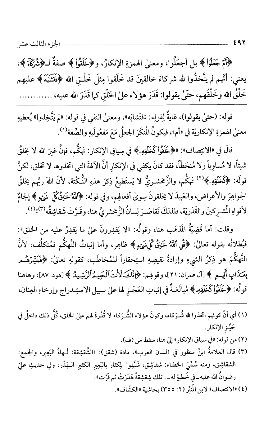 (أَمْ جَعَلُوا) بل اجعلوا، ومعنى الهمزة الإنكار و (خَلَقُوا) صفةٌ لـ (شركاء)، يعني أنهم لم يتخذوا لله شركاء خالقين قد خلقوا مثل خلق الله (فَتَشابَهَ) عليهم خلق الله وخلقهم، حتى يقولوا: قدر هؤلاء على الخلق كما قدر الله عليه،