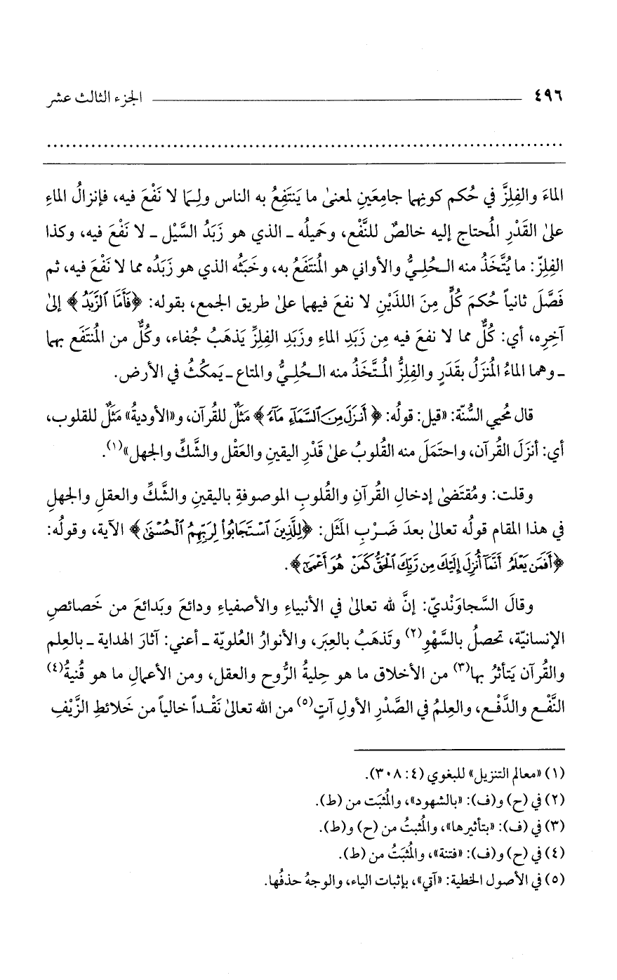 قال محيي السنة: "قيل: قوله: (أَنزَلَ مِنْ السَّمَاءِ مَاءً) مثل للقرآن، و"الأودية" مثل للقلوب، أي: أنزل القرآن، واحتمل منه القلوب على قدر اليقين والعقل والشك والجهل".