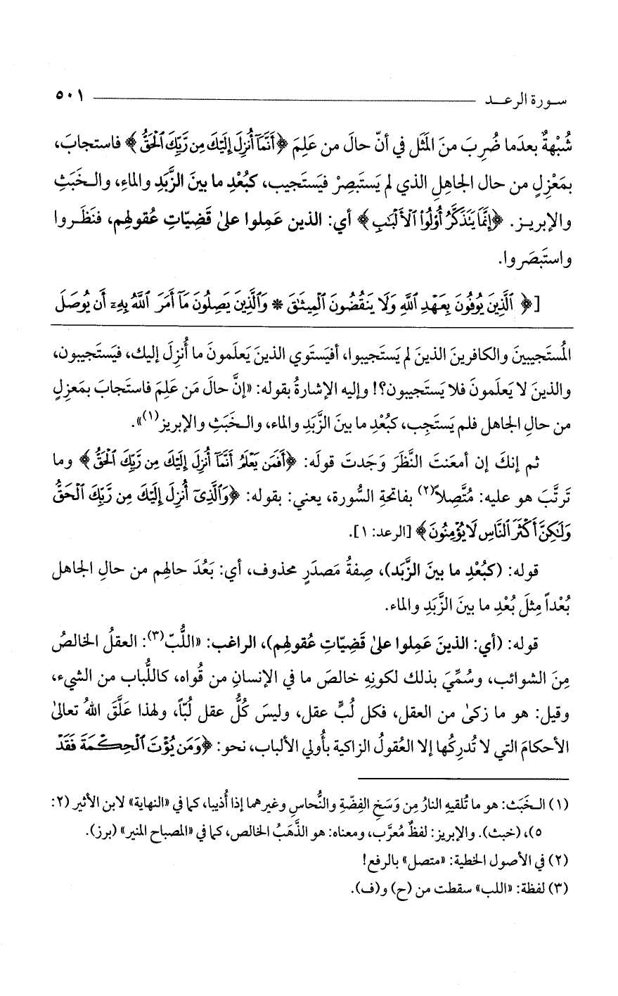 شُبهة بعد ما ضرب من المثل في أنّ حال من علم (أَنَّما أُنْزِلَ إِلَيْكَ مِنْ رَبِّكَ الْحَقُّ) فاستجاب، بمعزل من حال الجاهل الذي لم يستبصر فيستجيب: كبعد ما بين الزبد والماء، والخبث والإبريز. (إِنَّما يَتَذَكَّرُ أُولُوا الْأَلْبابِ) أي: الذين عملوا على قضيات عقولهم، فنظروا واستبصروا.