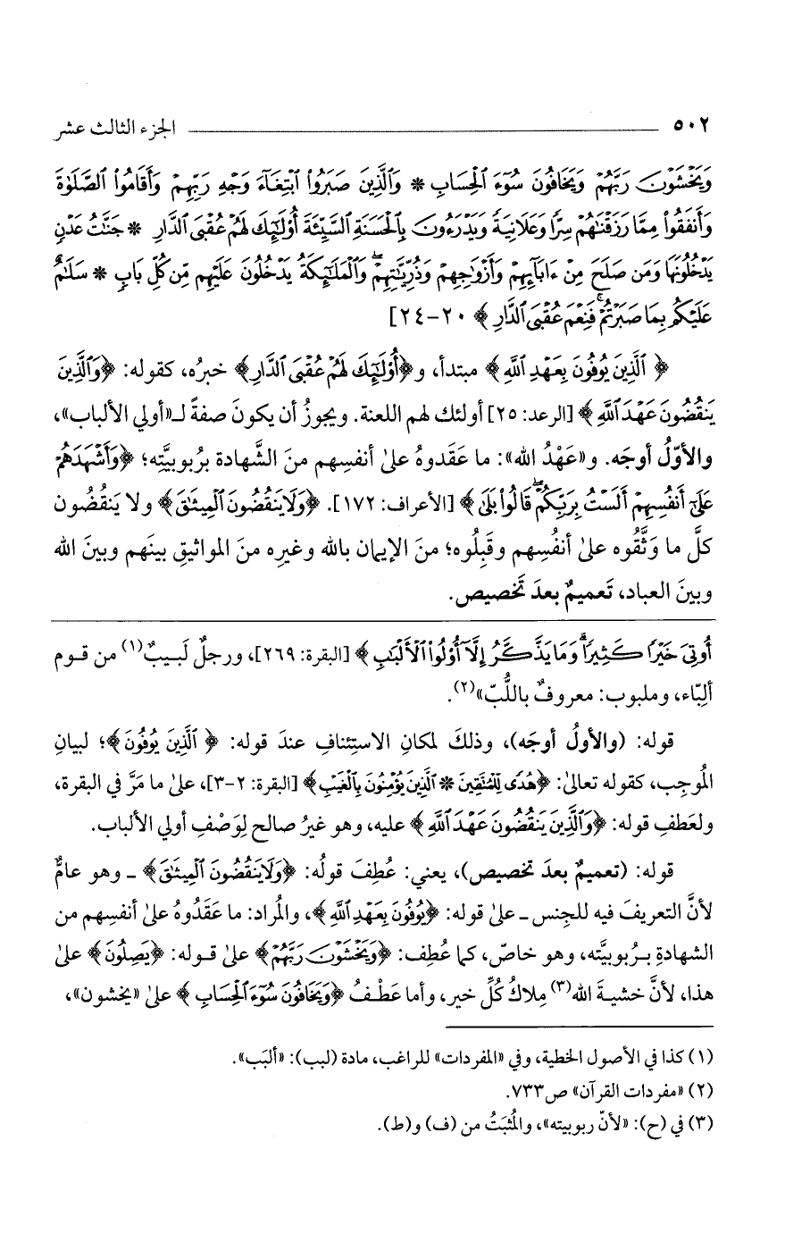 (الذين يوفون بعهد الله) مبتدأ، و (أولئك لهم عقبى الدار) خبره، كقوله: (والذين ينقضون عهد الله) [الرعد: 25] أولئك لهم اللعنة. ويجوز أن يكون صفة لـ"أولي الألباب"، والأوّل أوجه. و"عهد الله": ما عقدوه على أنفسهم من الشهادة بربوبيته؛ (وَأَشْهَدَهُمْ عَلى أَنْفُسِهِمْ أَلَسْتُ بِرَبِّكُمْ قالُوا بَلى) [الأعراف: 172]. (وَلا يَنْقُضُونَ الْمِيثاقَ) ولا ينقضون كل ما وثقوه على أنفسهم وقبلوه؛ من الإيمان بالله وغيره من المواثيق بينهم وبين الله وبين العباد، تعميم بعد تخصيص.