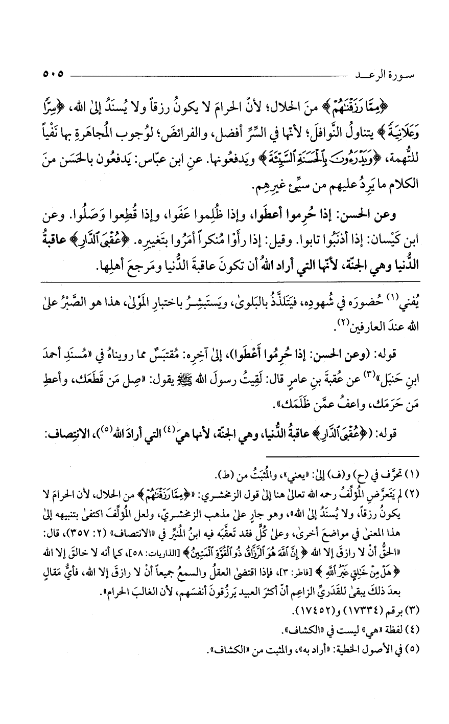 (مِمَّا رَزَقْناهُمْ) من الحلال، لأنّ الحرام لا يكون رزقا ولا يسند إلى الله، (سِرًّا وَعَلانِيَةً) يتناول النوافل، لأنها في السر أفضل، والفرائض، لوجوب المجاهرة بها نفياً للتهمة (وَيَدْرَؤُنَ بِالْحَسَنَةِ السَّيِّئَةَ) ويدفعونها. عن ابن عباس: يدفعون بالحسن من الكلام ما يرد عليهم من سيئ غيرهم.
