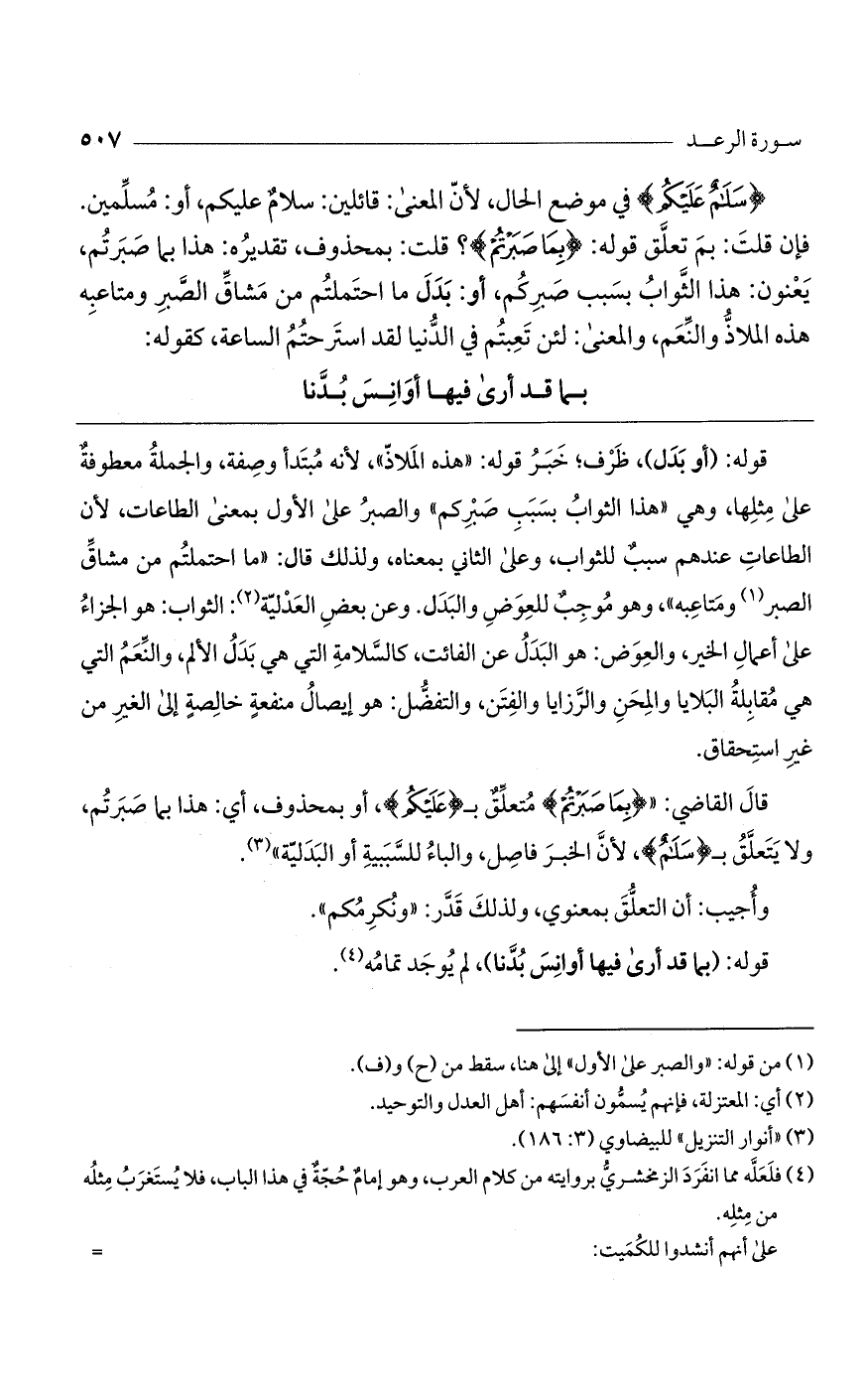 قال القاضي: " (بِمَا صَبَرْتُمْ) متعلق بـ (عَلَيْكُم)، أو بمحذوف، أي: هذا بما صبرتم، ولا يتعلق بـ (سَلَامٌ)، لأن الخبر فاصل، والباء للسببية أو البدلية".