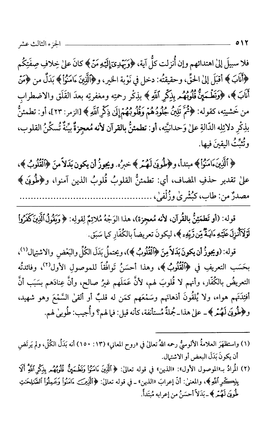 قوله: (ويجوز أن يكون بدلاً من (الْقُلُوبُ))، ويحتمل بدل الكل والبعض والاشتمال، بحسب التعريف في (الْقُلُوبُ)، وهذا أحسن توافقاً للموصول الأول، وفائدته التعريض بالكفار، وأنهم لا قلوب لهم، لأن عملهم غير صالح، وأن عنادهم بسبب أن أفئدتهم هواء، ولا يلقون أذهانهم وسمعهم كمن له قلب أو ألقى السمع وهو شهيد، و (طُوبَى لَهُمْ) - على هذا- جملة مستأنفة، كأنه قيل: فما لهم؟ وأجيب: طوبى لهم.