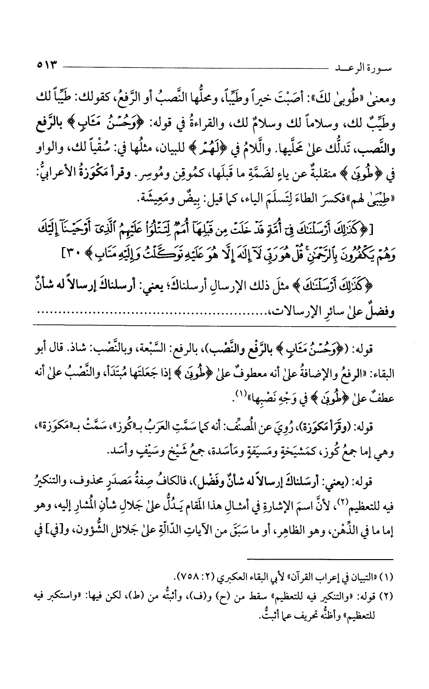 ومعنى «طوبى لك»: أصبت خيراً وطيبا، ومحلها النصب أو الرفع، كقولك: طيبا لك، وطيب لك، وسلاماً لك، وسلامٌ لك، والقراءة في قوله: (وَحُسْنُ مَآبٍ) بالرفع والنصب، تدلك على محليها. واللام في (لَهُمْ) للبيان، مثلها في سقياً لك، والواو في (طوبى) منقلبةٌ عن ياء لضمة ما قبلها، كموقن وموسر. وقرأ مكوزة الأعرابي: "طيبى لهم" فكسر الطاء لتسلم الياء، كما قيل: بيضٌ ومعيشة.