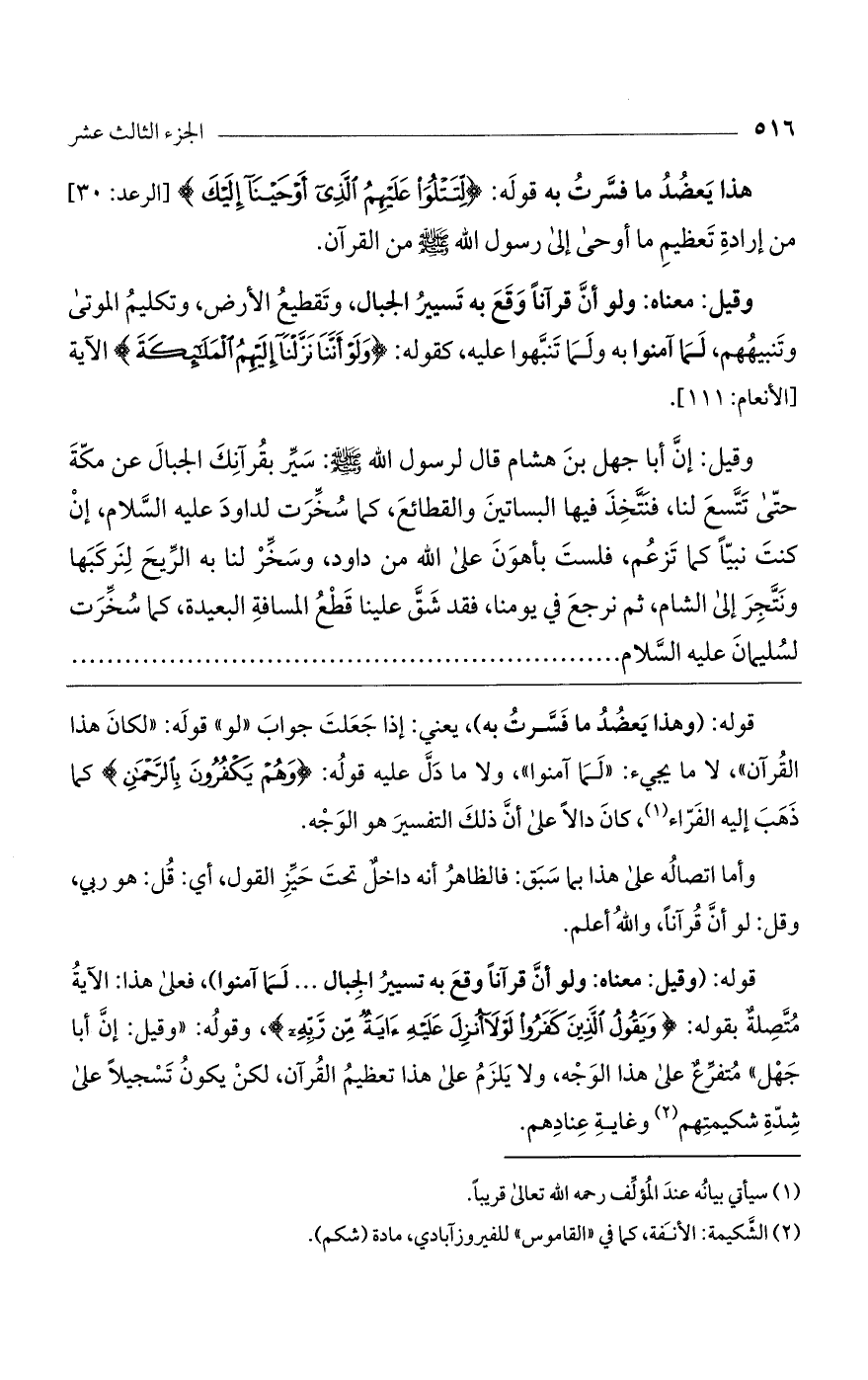 قوله: (وقيل: معناه: ولو أن قرآناً وقع به تسيير الجبال ... لما آمنوا)، فعلى هذا: الآية متصلة بقوله: (وَيَقُولُ الَّذِينَ كَفَرُوا لَوْلا أُنزِلَ عَلَيْهِ آيَةٌ مِنْ رَبِّهِ)، وقوله: "وقيل: إن أبا جهل" متفرع على هذا الوجه، ولا يلزم على هذا تعظيم القرآن، لكن يكون تسجيلاً على شدة شكيمتهم وغاية عنادهم.