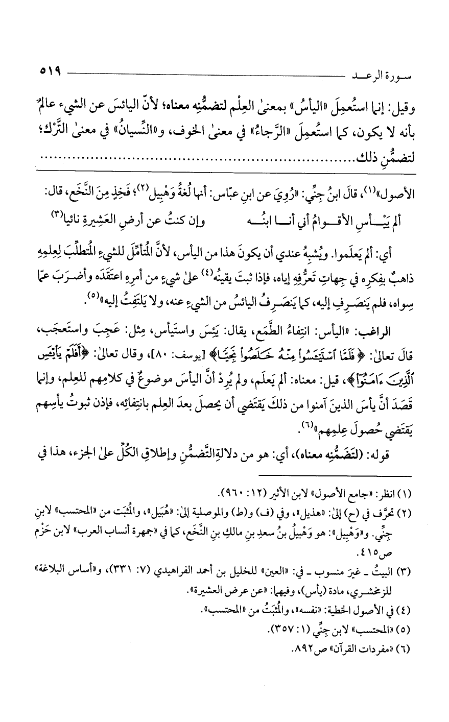 الراغب: "اليأس: انتفاء الطمع، يقال: يئس واستيأس، مثل: عجب واستعجب، قال تعالى: (فَلَمَّا اسْتَيْئَسُوا مِنْهُ خَلَصُوا نَجِيّاً) [يوسف: 80]، وقال تعالى: (أَفَلَمْ يَيْئَسْ الَّذِينَ آمَنُوا)، قيل: معناه: ألم يعلم، ولم يرد أن اليأس موضوع في كلامهم للعلم، وإنما قصد أن يأس الذين آمنوا من ذلك يقتضي أن يحصل بعد العلم بانتفائه، فإذن ثبوت يأسهم يقتضي حصول علمهم".