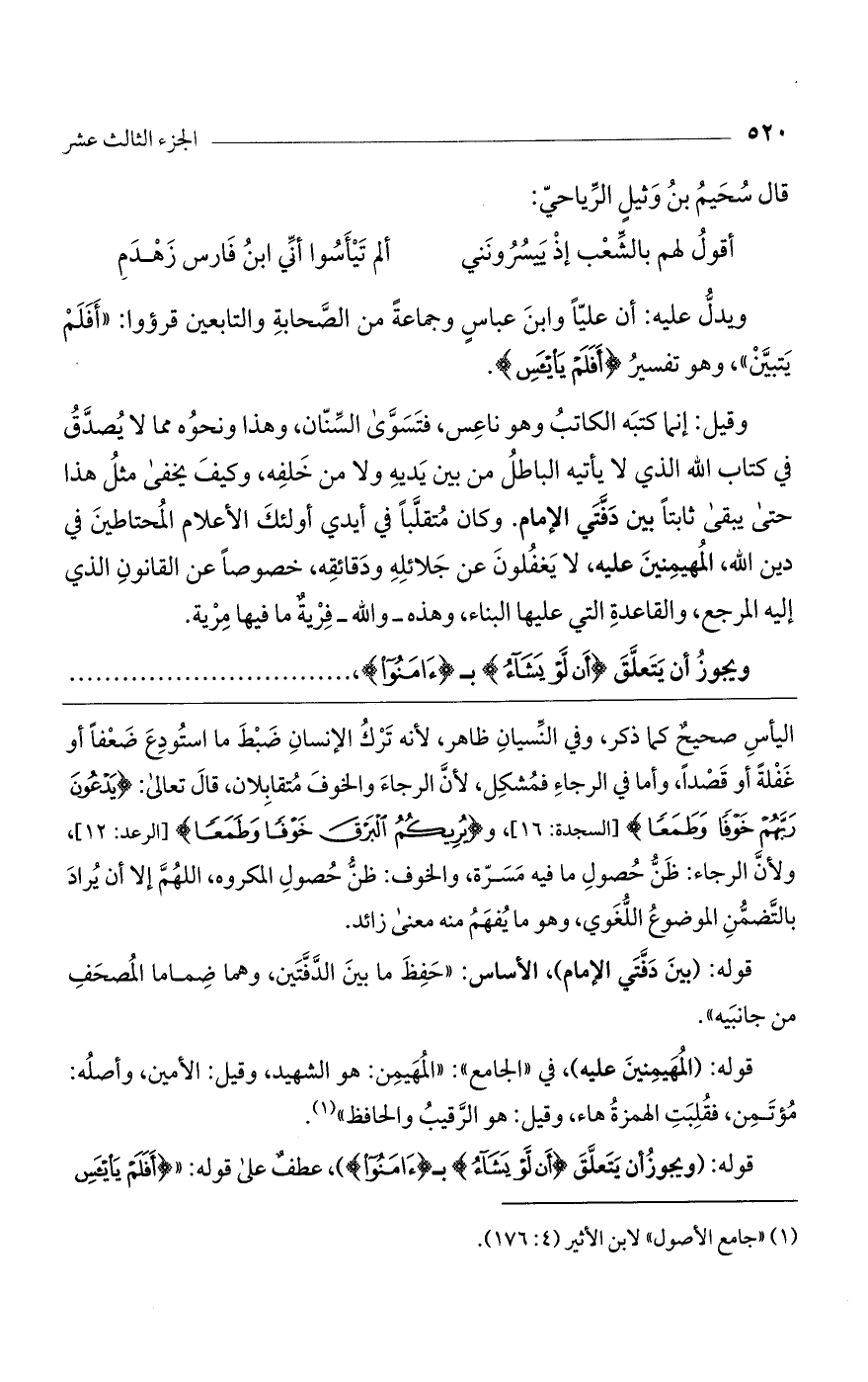وقيل: إنما كتبه الكاتب وهو ناعس مستوى السينات، وهذا ونحوه مما لا يصدق في كتاب الله الذي لا يأتيه الباطل من بين يديه ولا من خلفه، وكيف يخفى مثل هذا حتى يبقى ثابتاً بين دفتي الإمام. وكان متقلباً في أيدى أولئك الأعلام المحتاطين في دين الله المهيمنين عليه لا يغفلون عن جلائله ودقائقه، خصوصاً عن القانون الذي إليه المرجع، والقاعدة التي عليها البناء، وهذه - والله - فريةٌ ما فيها مرية.