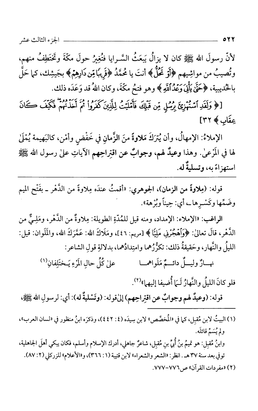 الراغب: "الإملاء: الإمداد، ومنه قيل للمدة الطويلة: ملاوة من الدهر، وملي من الدهر، قال تعالى: (وَاهْجُرْنِي مَلِيّاً) [مريم: 46]، وملاك الله: عمرك الله، والملوان: قيل: الليل والنهار، وحقيقة ذلك: تكررهما وامتدادهما، بدلالة قول الشاعر: