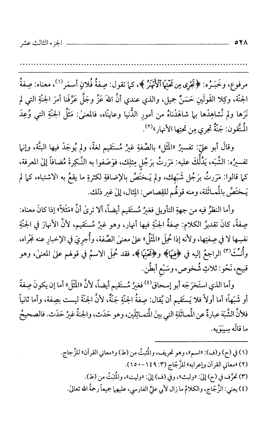 وأما النظر فيه من جهة التأويل فغير مستقيم أيضاً، ألا ترى أن "مثلاً" إذا كان معناه: صفة، كان تقدير الكلام: صفة الجنة فيها أنهار، وهو غير مستقيم، لأن الأنهار في الجنة نفسها لا في صفتها، ولأنه إذا حمل "المثل" على معنى الصفة، وأجرى في الإخبار عنه مجراه، وأنث الراجع إليه في (فِيهَا) و (تَحْتِهَا)، فقد حمل الاسم في قولهم على المعنى، وهو قبيح، نحو: ثلاث شخوص، وسبع أبطن.