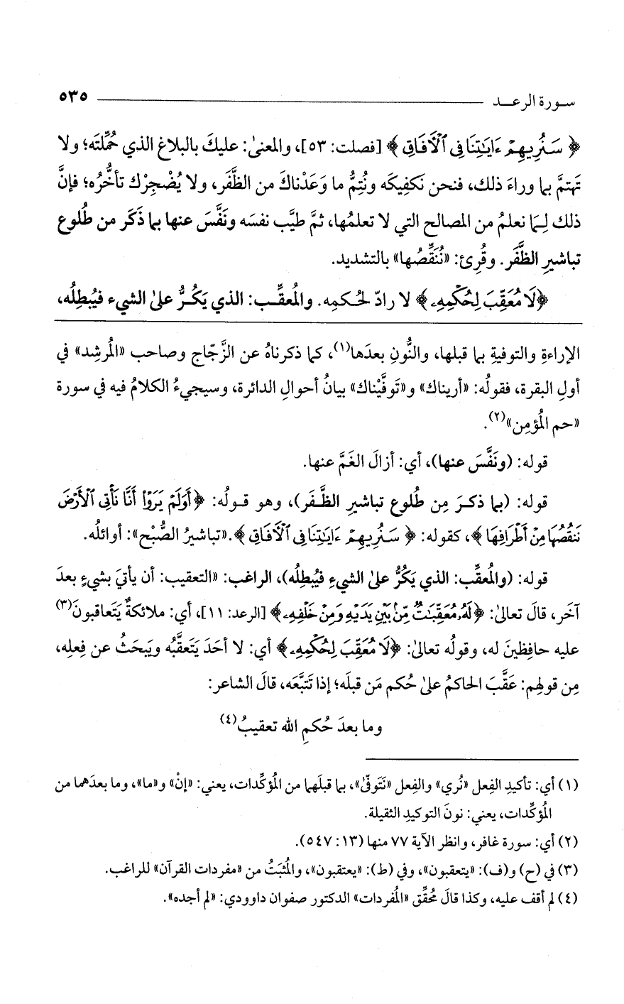 قوله: (والمعقب: الذي يكر على الشيء فيبطله)، الراغب: "التعقيب: أن يأتي بشيء بعد آخر، قال تعالى: (لَهُ مُعَقِّبَاتٌ مِنْ بَيْنِ يَدَيْهِ وَمِنْ خَلْفِهِ) [الرعد: 11]، أي: ملائكة يتعاقبون عليه حافظين له، وقوله تعالى: (لا مُعَقِّبَ لِحُكْمِهِ) أي: لا أحد يتعقبه ويبحث عن فعله، من قولهم: عقب الحاكم على حكم من قبله؛ إذا تتبعه، قال الشاعر: