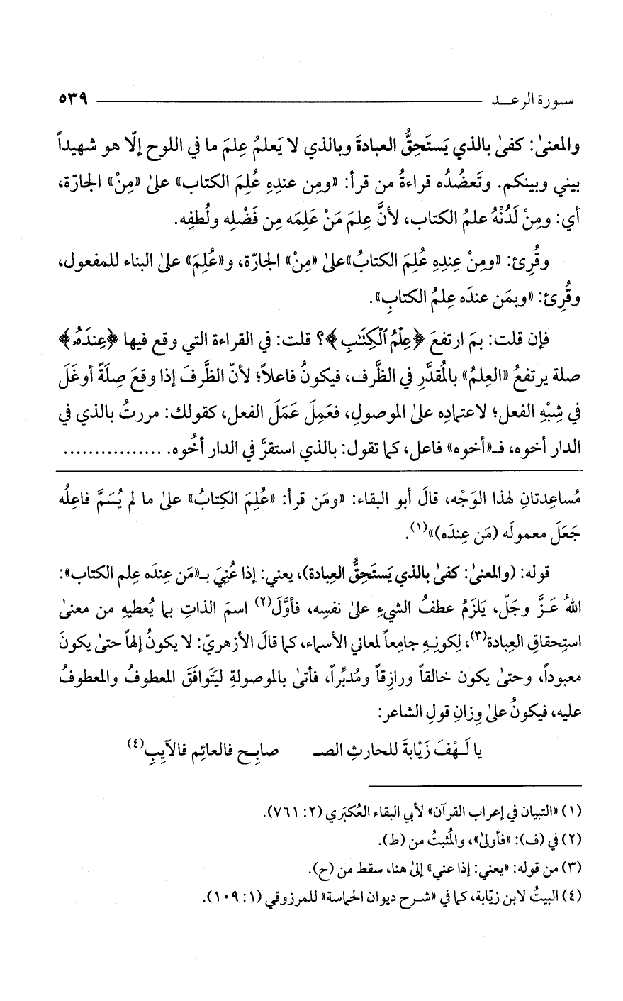 وقرئ: "ومن عنده علم الكتاب" على "من" الجارّة، و"علم" على البناء للمفعول. وقرئ: "وبمن عنده علم الكتاب".