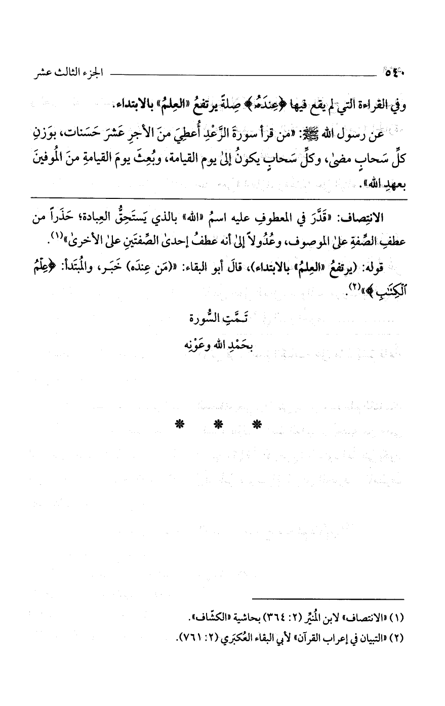 قوله: (يرتفع "العلم" بالابتداء)، قال أبو البقاء: " (من عنده) خبر، والمبتدأ: (عِلْمُ الكِتَابِ) ".
