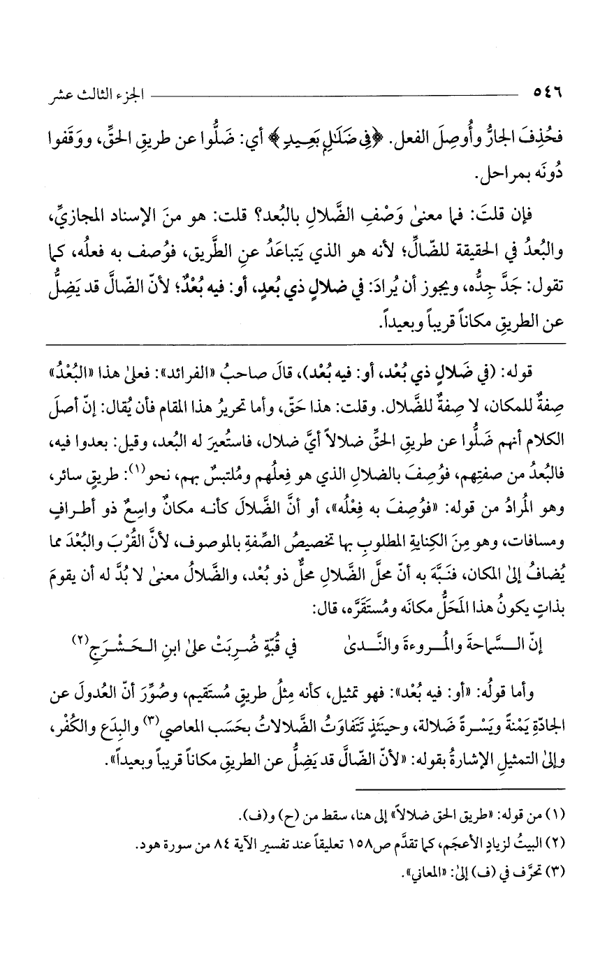 فإن قلت: فما معنى وصف الضلال بالبعد؟ قلت: هو من الإسناد المجازي، والبعد في الحقيقة للضالّ، لأنه هو الذي يتباعد عن الطريق، فوصف به فعله، كما تقول: جدّ جدّه. ويجوز أن يراد: في ضلال ذي بعدٍ، أو: فيه بعدٌ، لأنّ الضالّ قد يضلّ عن الطريق مكاناً قريباً وبعيداً.