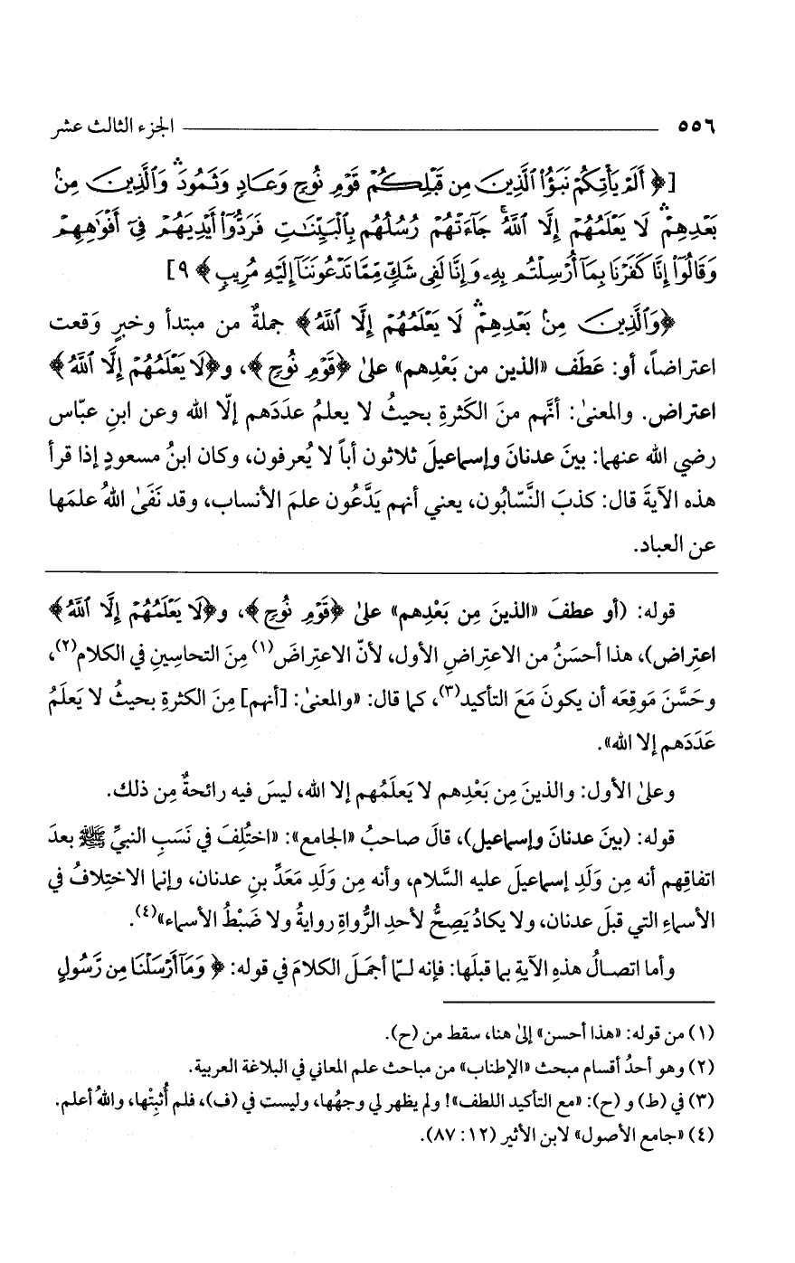 قوله: (أو عطف "الذين من بعدهم" على (قَوْمِ نُوحٍ)، و (لَا يَعْلَمُهُمْ إِلَّا اللهُ) اعتراض)، هذا أحسن من الاعتراض الأول، لأن الاعتراض من التحاسين في الكلام، وحسن موقعه أن يكون مع التأكيد، كما قال: "والمعنى: [أنهم] من الكثرة بحيث لا يعلم عددهم إلا الله".