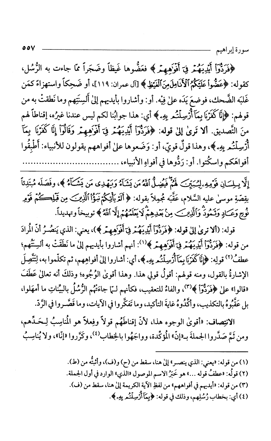 قوله: (ألا ترى إلى قوله: (فَرَدُّوا أَيْدِيَهُمْ فِي أَفْوَاهِهِمْ))، يعني: الذي ينصر أن المراد من قوله: (فَرَدُّوا أَيْدِيَهُمْ فِي أَفْوَاهِهِمْ): أنهم أشاروا بأيديهم إلى ما نطقت به ألسنتهم؛ عطف قوله: (إِنَّا كَفَرْنَا بِمَا أُرْسِلْتُمْ بِهِ)، أي: أشاروا إلى أفواههم، ثم تكلموا به، لتتصل الإشارة بالقول، ومنه قولهم: أقول قولي هذا. وهذا أقوى الوجوه؛ وذلك أنه تعالى عطف "قالوا" على (فَرَدُّوا)، والفاء للتعقيب، فكأنهم لما جاءتهم الرسل بالبينات ما أمهلوا، بل عقبوه بالتكذيب، وأكدوه غاية التأكيد، وما تفكروا في الآيات، وما قصروا في الرد.