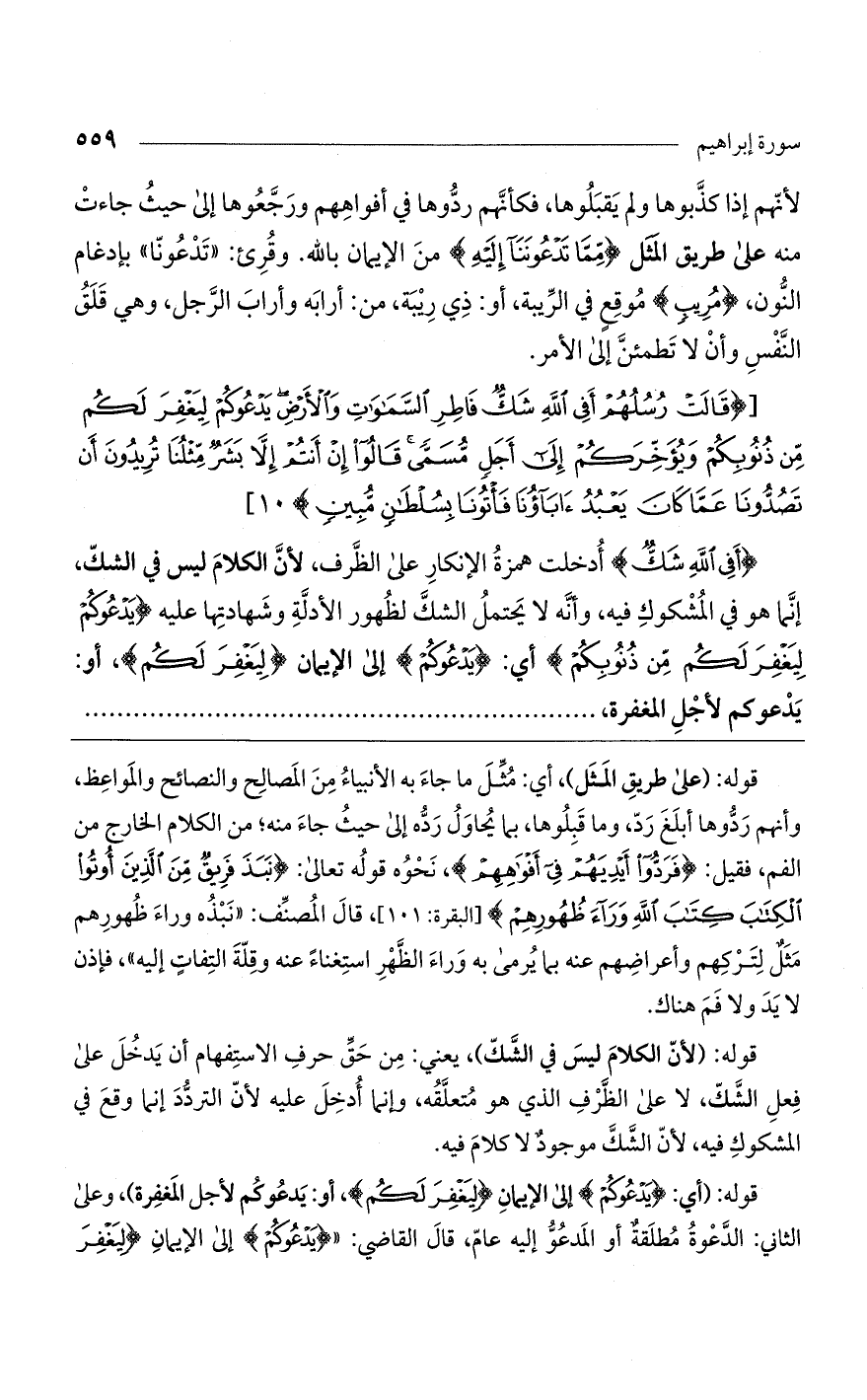 [(قالَتْ رُسُلُهُمْ أَفِي اللَّهِ شَكٌّ فاطِرِ السَّماواتِ وَالْأَرْضِ يَدْعُوكُمْ لِيَغْفِرَ لَكُمْ مِنْ ذُنُوبِكُمْ وَيُؤَخِّرَكُمْ إِلى أَجَلٍ مُسَمًّى قالُوا إِنْ أَنْتُمْ إِلاَّ بَشَرٌ مِثْلُنا تُرِيدُونَ أَنْ تَصُدُّونا عَمَّا كانَ يَعْبُدُ آباؤُنا فَاتُونا بِسُلْطانٍ مُبِينٍ)].