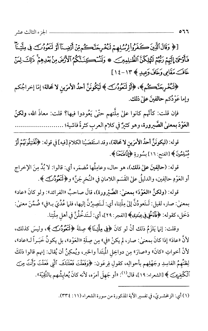 وقلت: إنما يلزم ذلك أن لو كان (فِي مِلَّتِنَا) صلة (لَتَعُودُنَّ)، وليس كذلك، لأن "عاد" إذا كان بمعنى: صار، لم يكن "في" من صلة "العود"، بل يكون خبراً لـ "عاد"، لأن أخوات "كان" و"صار" من دواخل المبتدأ والخبر، ويمكن أن يقال: إنهم قالوا ذلك لظنهم الفاسد وجهلهم بأحواله، كقول فرعون: (وَفَعَلْتَ فَعْلَتَكَ الَّتِي فَعَلْتَ وَأَنْتَ مِنْ الْكَافِرِينَ) [الشعراء: 19]، قال: "أو جهل أمره، لأنه كان يعايشهم بالتقية".