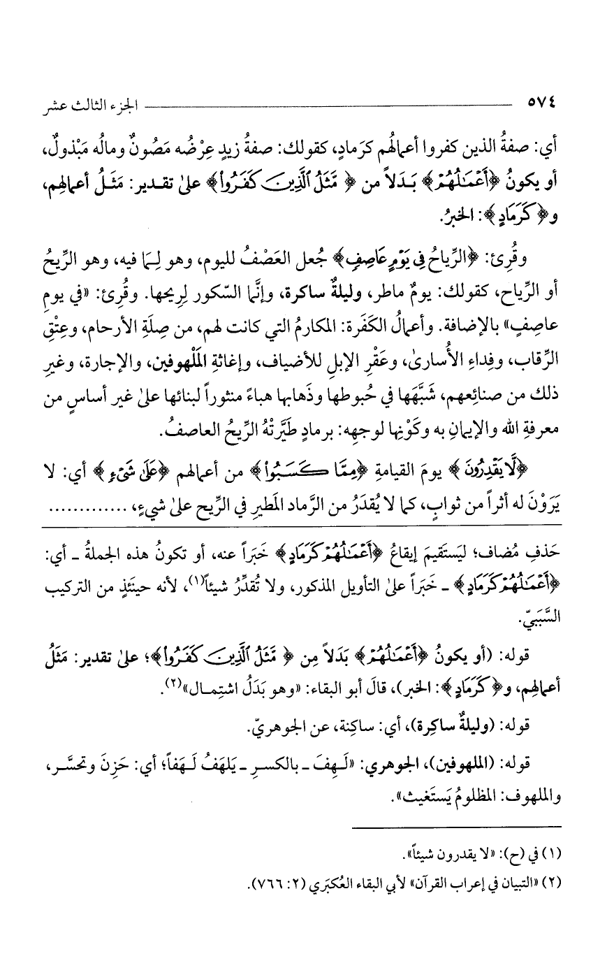 قوله: (أو يكون (أَعْمَالُهُمْ) بدلاً من (مَثَلُ الَّذِينَ كَفَرُوا)؛ على تقدير: مثل أعمالهم، و (كَرَمَادٍ): الخبر)، قال أبو البقاء: "وهو بدل اشتمال".