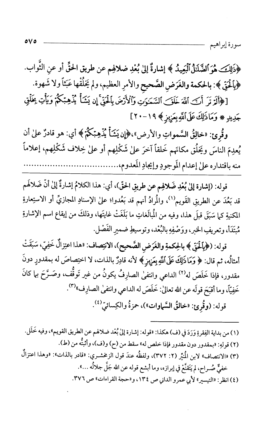 قوله: ((بِالْحَقِّ) بالحكمة والغرض الصحيح)، الانتصاف: "هذا اعتزال خفي، سبقت أمثاله، ثم قال: (وَمَا ذَلِكَ عَلَى اللهِ بِعَزِيزٍ) لأنه قادر بالذات، لا اختصاص له بمقدور دون مقدور، فإذا خلص له الداعي وانتفى الصارف يكون من غير توقف، وصرح بما كان خفياً، وما أقبح قوله عن الله تعالى: خلص له الداعي وانتفى الصارف".