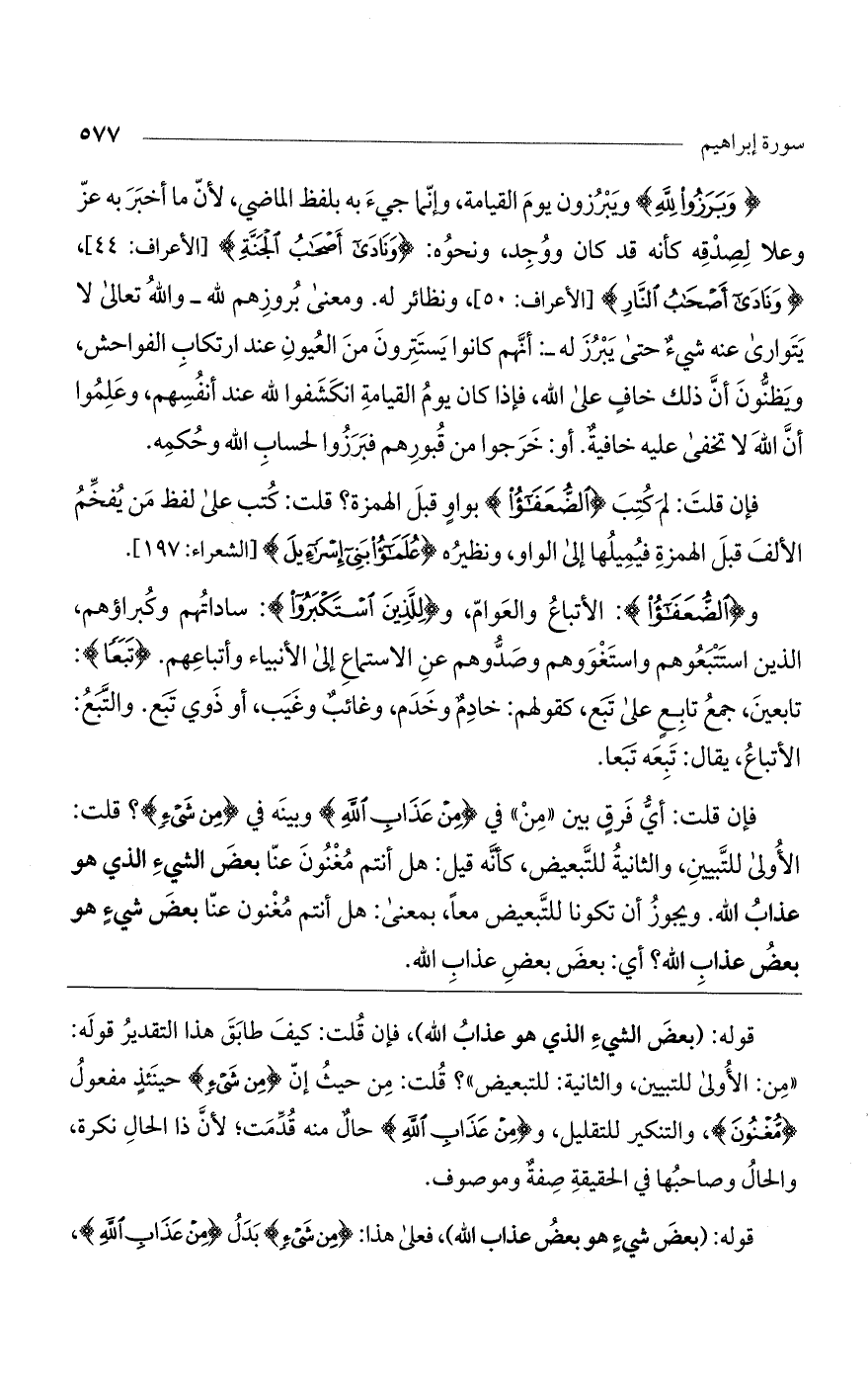 فإن قلت: أي: فرقٍ بين "من" في (مِنْ عَذابِ اللَّهِ) وبينه في (مِنْ شَيْءٍ)؟ قلت: الأولى للتبيين، والثانية للتبعيض، كأنه قيل: هل أنتم مغنون عنا بعض الشيء الذي هو عذاب الله. ويجوز أن تكونا للتبعيض معاً، بمعنى: هل أنتم مغنون عنا بعض شيء هو بعض عذاب الله، أى: بعض بعض عذاب الله.
