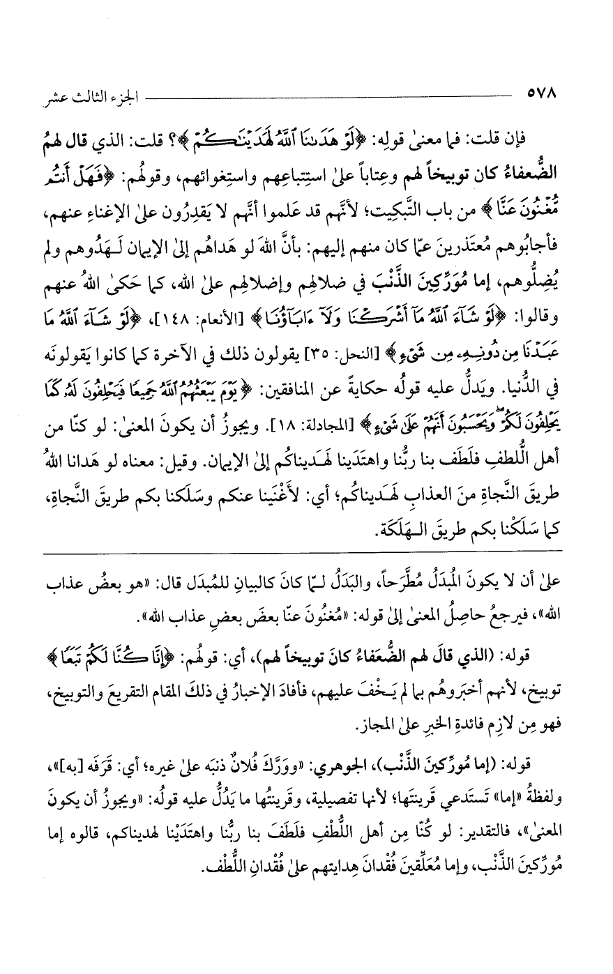 قوله: (إما موركين الذنب)، الجوهري: "وورك فلان ذنبه على غيره؛ أي: قرفه [به] "، ولفظة "إما" تستدعي قرينتها؛ لأنها تفصيلية، وقرينتها ما يدل عليه قوله: "ويجوز أن يكون المعنى"، فالتقدير: لو كنا من أهل اللطف فلطف بنا ربنا واهتدينا لهديناكم، قالوه إما موركين الذنب، وإما معلقين فقدان هدايتهم على فقدان اللطف.